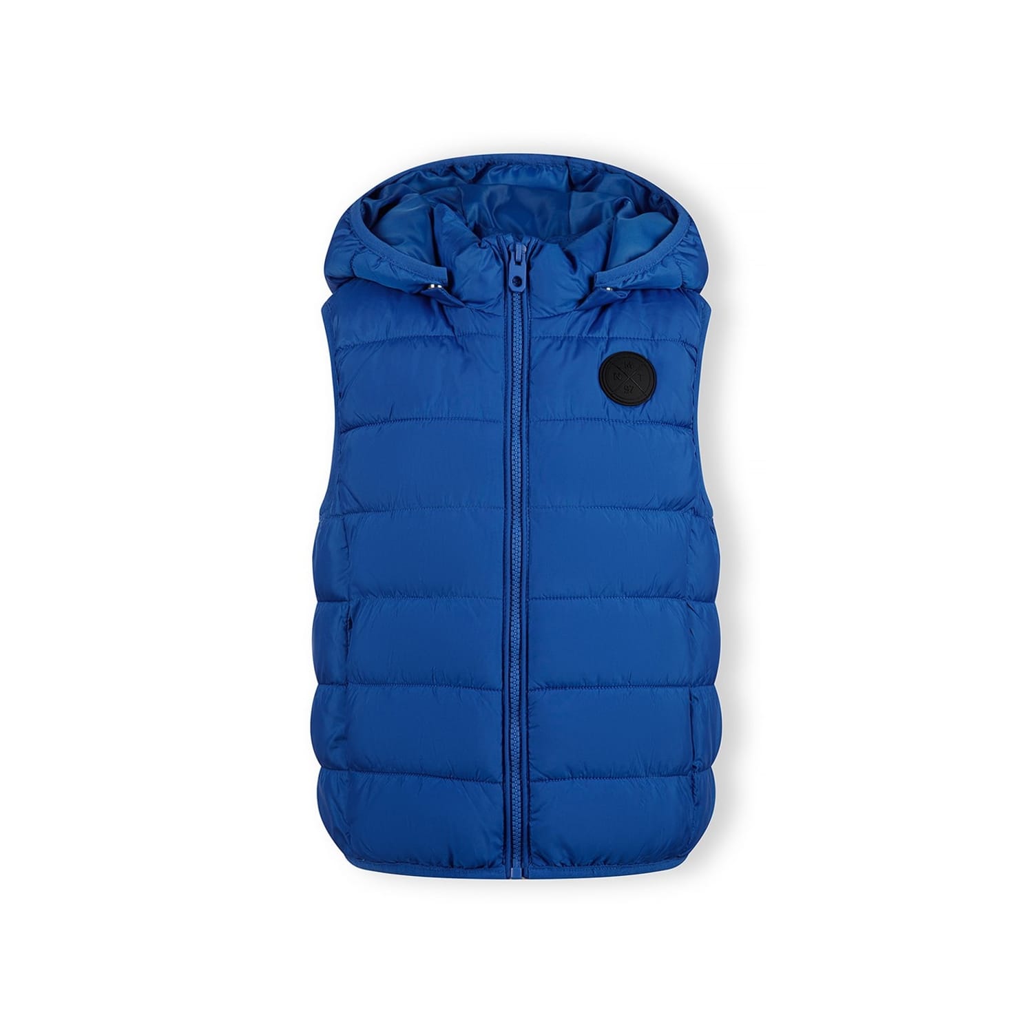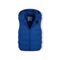 Boys padded gilet designed to offer lightweight warmth and versatility in a cobalt blue finish. The padded insulation provides effective layering for cooler conditions while keeping the garment light to wear. It features a soft standing collar that enhances coverage and protection from the elements. Elasticated trims at the armholes and hem improve fit and seal out drafts. The detachable hood, lined with soft jersey fabric, fastens with snap buttons enabling easy removal and added adaptability. Discreet hidden side pockets offer practical storage while maintaining a minimalist look complemented by a subtle rubber badge on the chest. Suitable for layering over hoodies or as a standalone outerwear piece, this gilet adapts to various casual styles and fluctuating temperatures.