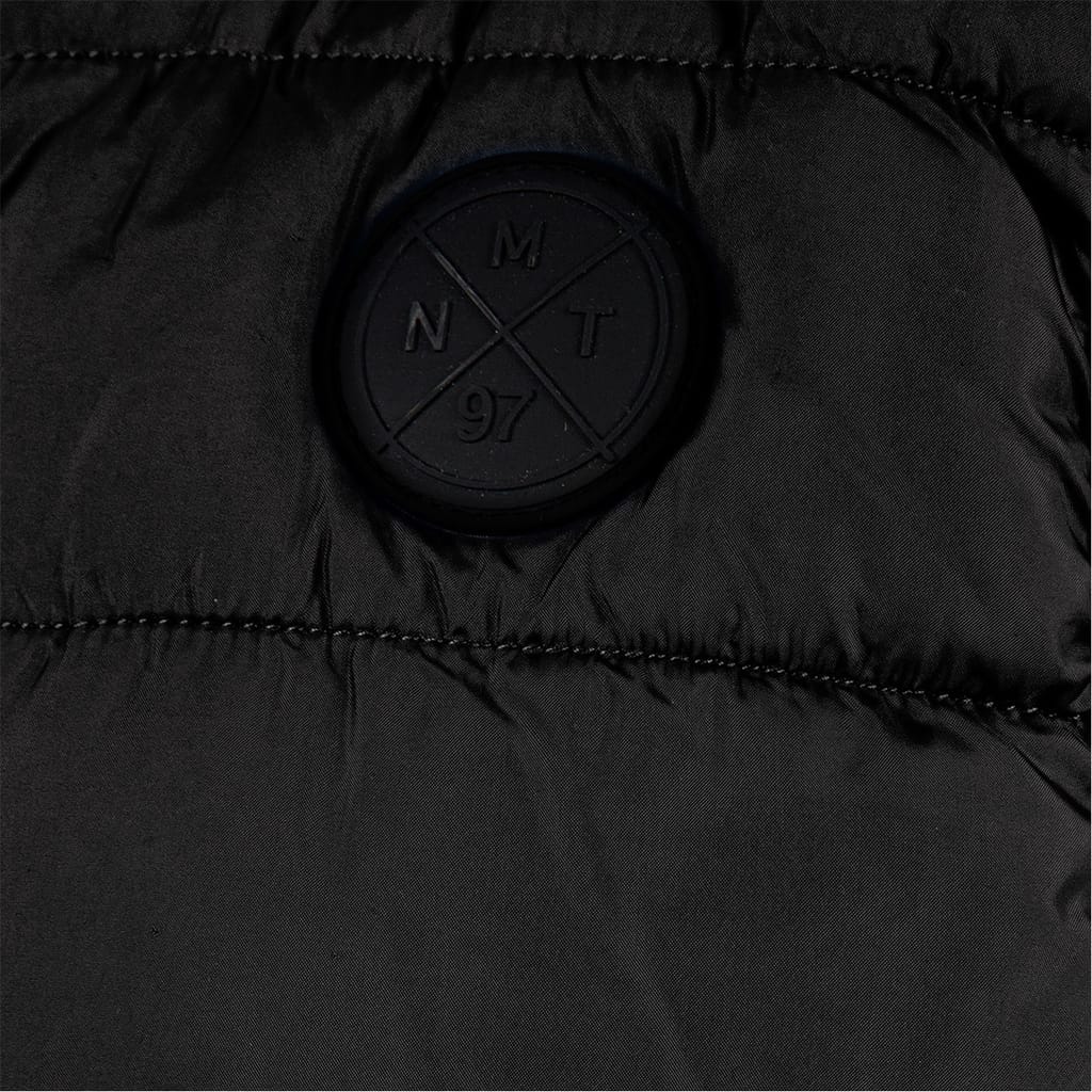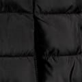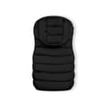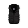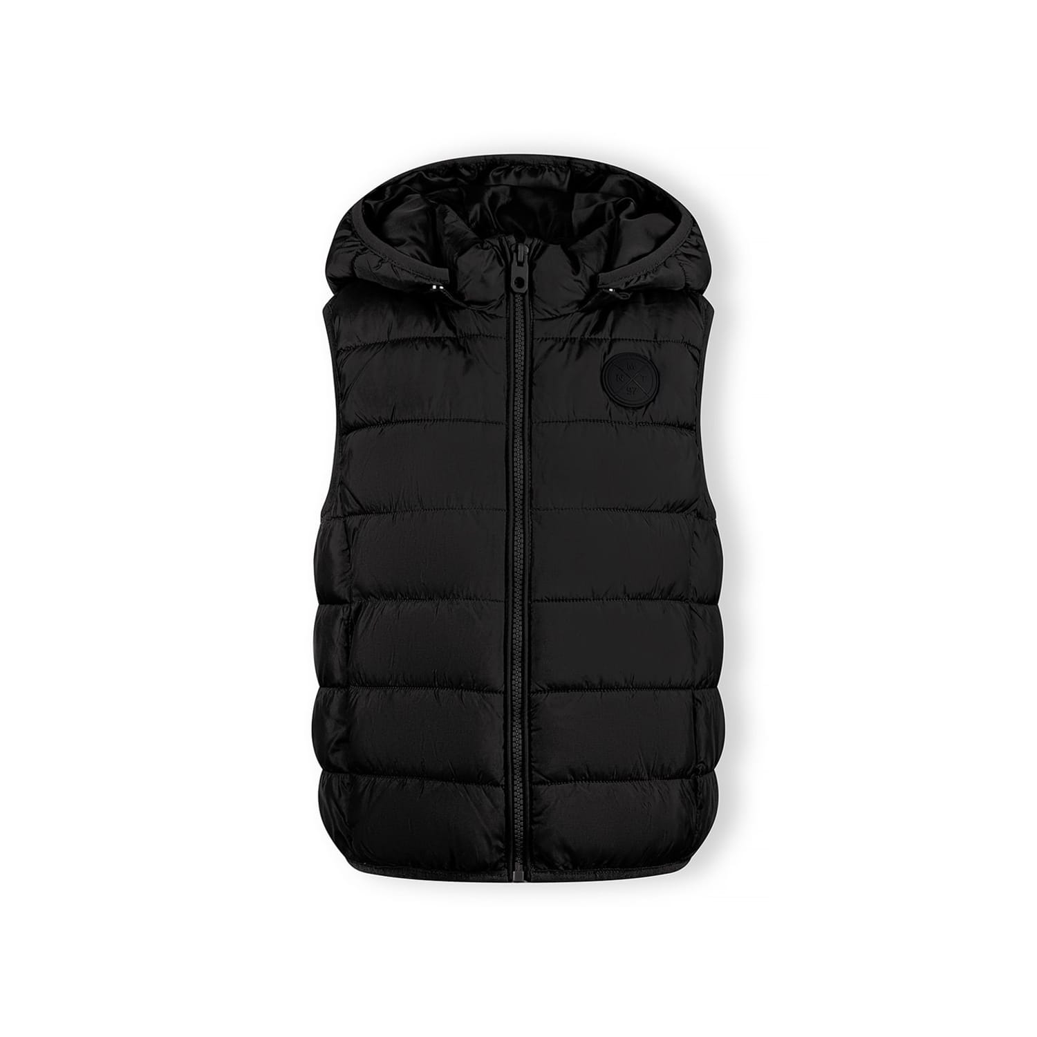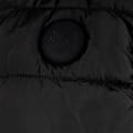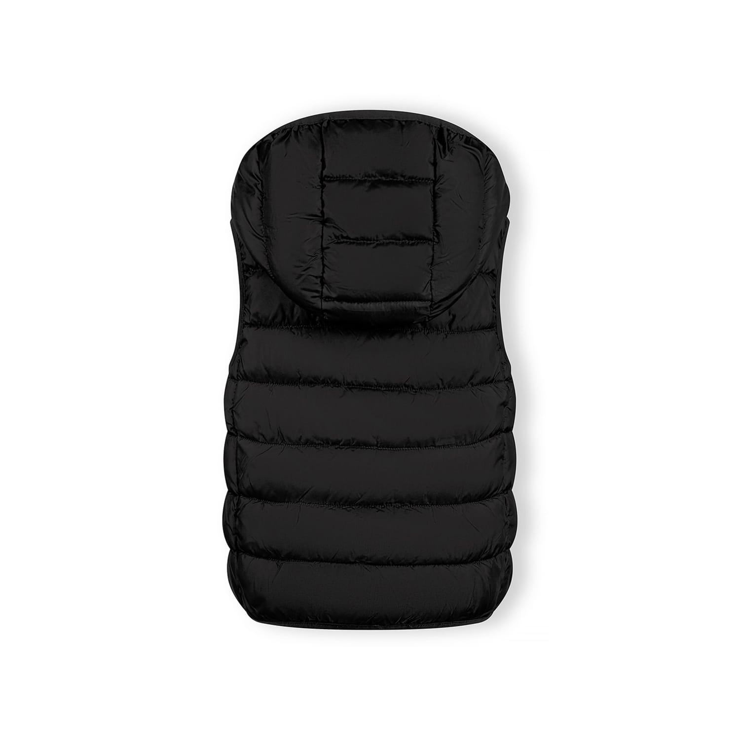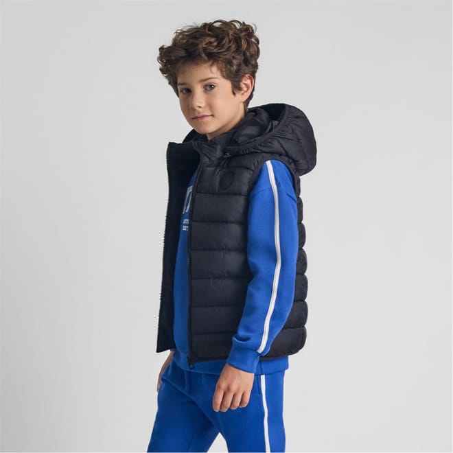 A boys lightweight padded gilet in black designed for layering during changing seasons. It features a soft standing collar that provides comfort around the neck and elasticated hems and armholes that maintain a secure fit without restricting movement. The detachable hood includes a jersey lining for softness against the skin and is secured with snap fasteners for easy removal, allowing adaptability to different weather conditions. Two concealed side pockets offer discreet storage while preserving the sleek, streamlined design. A subtle rubber badge on the chest adds a minimalist branding detail. The gilet can be worn over hoodies or other clothing items, serving as a practical addition to seasonal wardrobes for varied styling options and comfort in fluctuating temperatures.