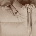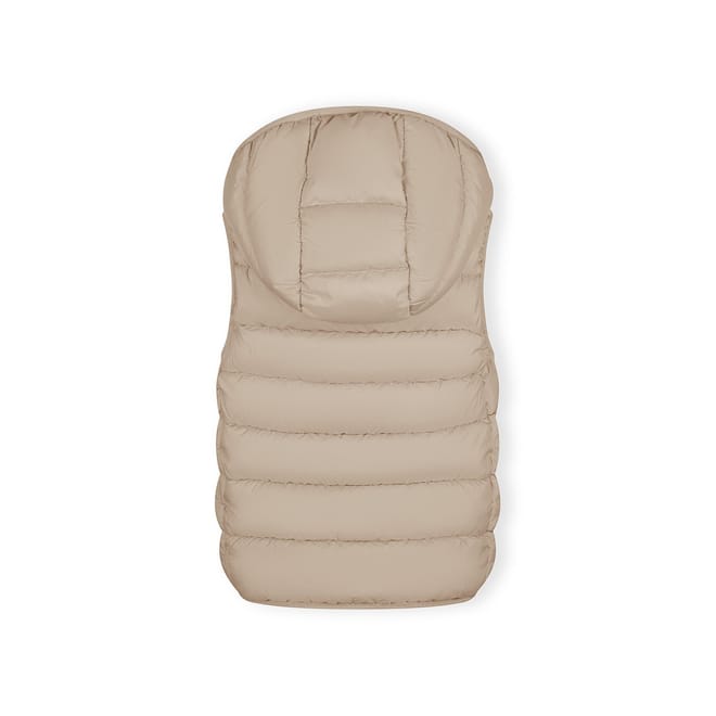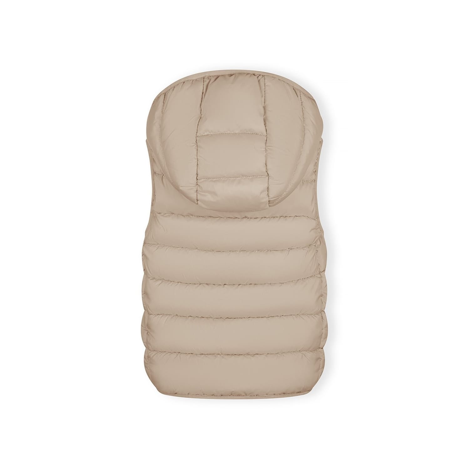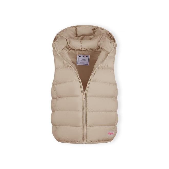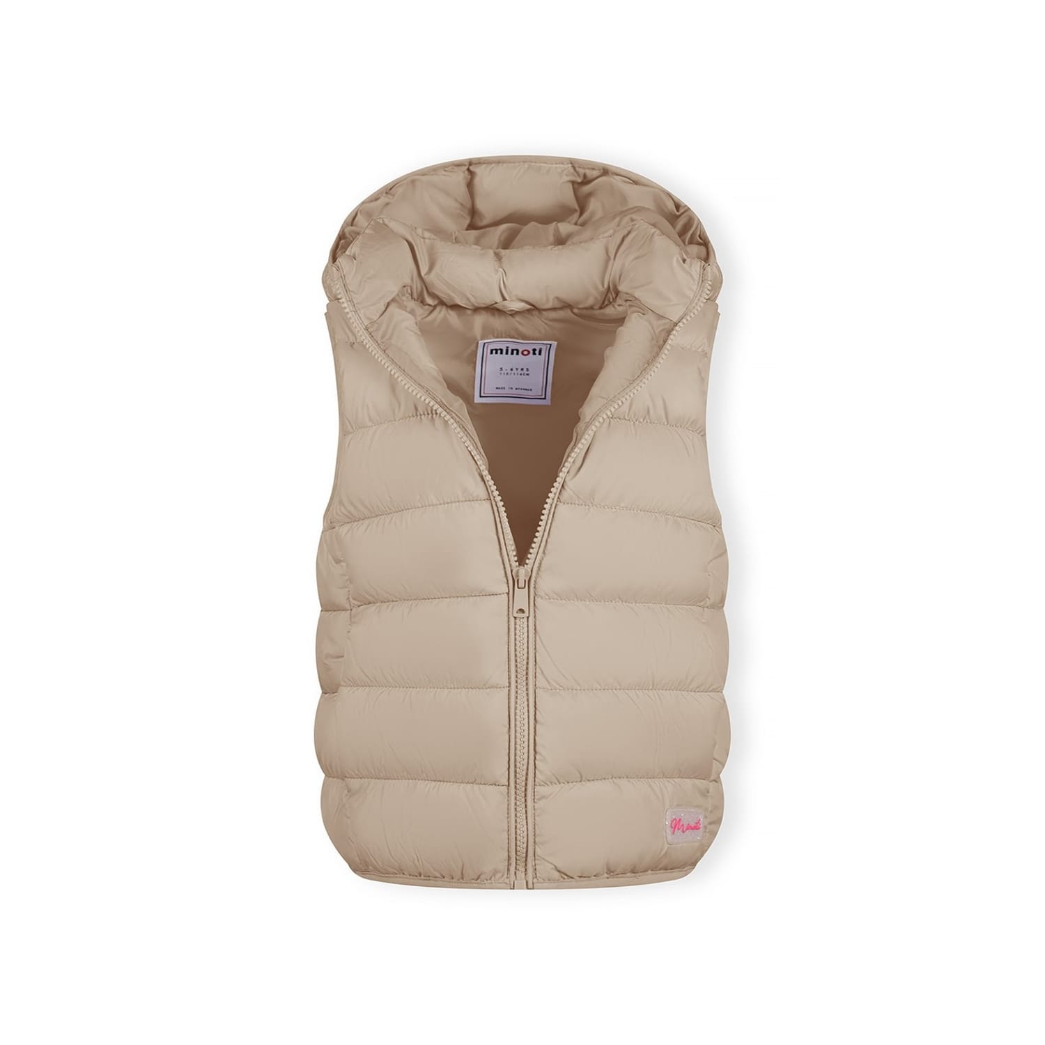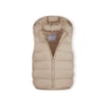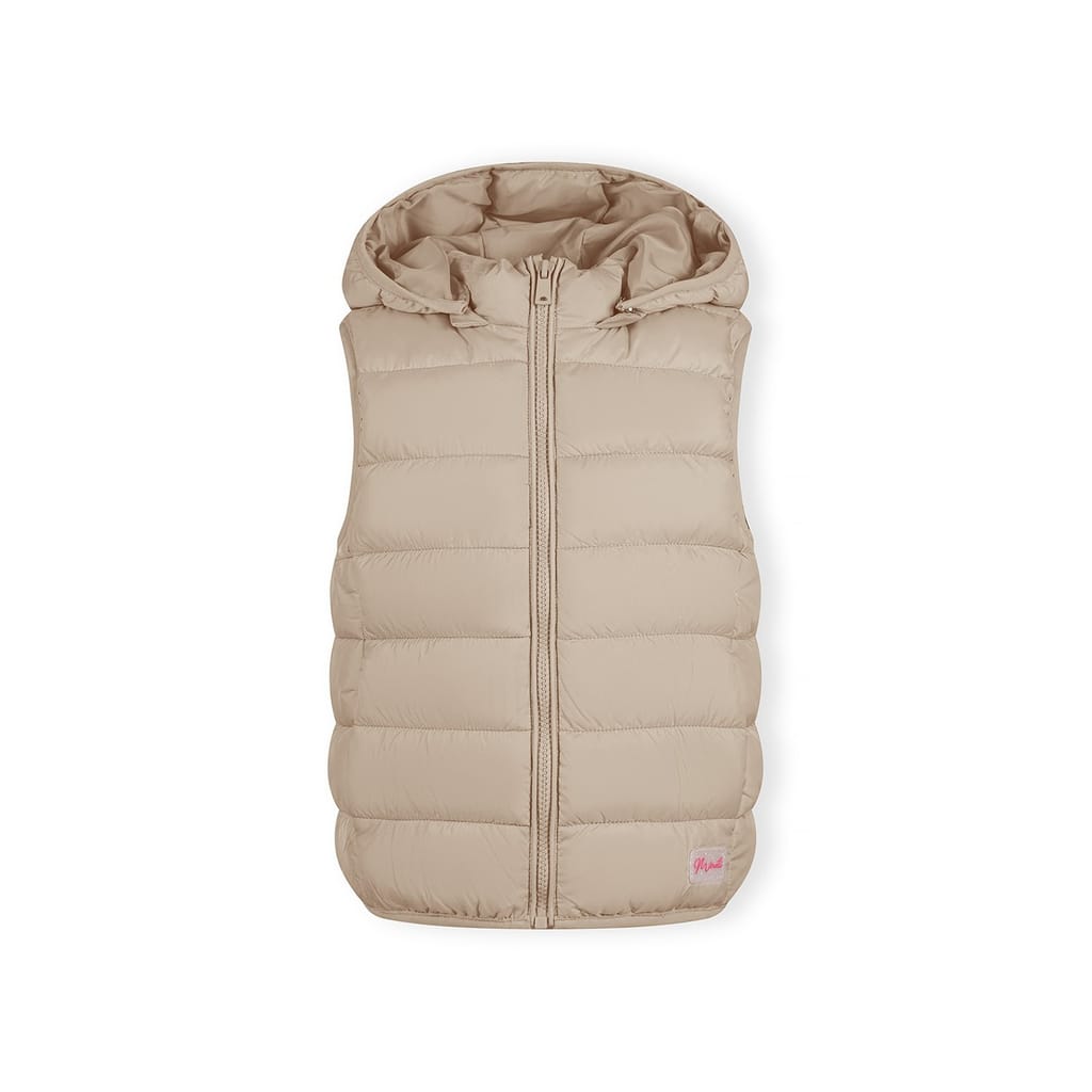 Quilted sleeveless gilet designed for girls, suitable for layering during transitional seasons. The gilet features lightweight padding providing warmth without bulk, in a beige tone with a subtle front patch. It incorporates a high stand-up collar for enhanced comfort and additional neck coverage. The design includes a detachable hood allowing adjustment for changing weather conditions. A full-length front zip with an upper zipper guard prevents irritation. The concealed side seam pockets maintain the garment’s sleek appearance while offering practicality. The relaxed fit supports ease of movement and comfortable layering over other tops or dresses.