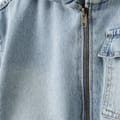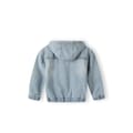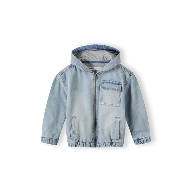 Boys denim jacket designed for casual outerwear in light blue with a classic denim finish. It has an attached hood for additional coverage and a front zip fastening for easy wear. The jacket features two front pockets that provide practical storage. Its straight cut ensures a relaxed fit suitable for layering. Long sleeves are completed with ribbed cuffs that secure snugly at the wrists, while the ribbed hem offers a comfortable fit at the waist. Visible stitch lines add to the jacket's durability and structure. Constructed for everyday use during transitional seasons, this jacket balances functionality with simple style, strictly based on the visible product attributes.
