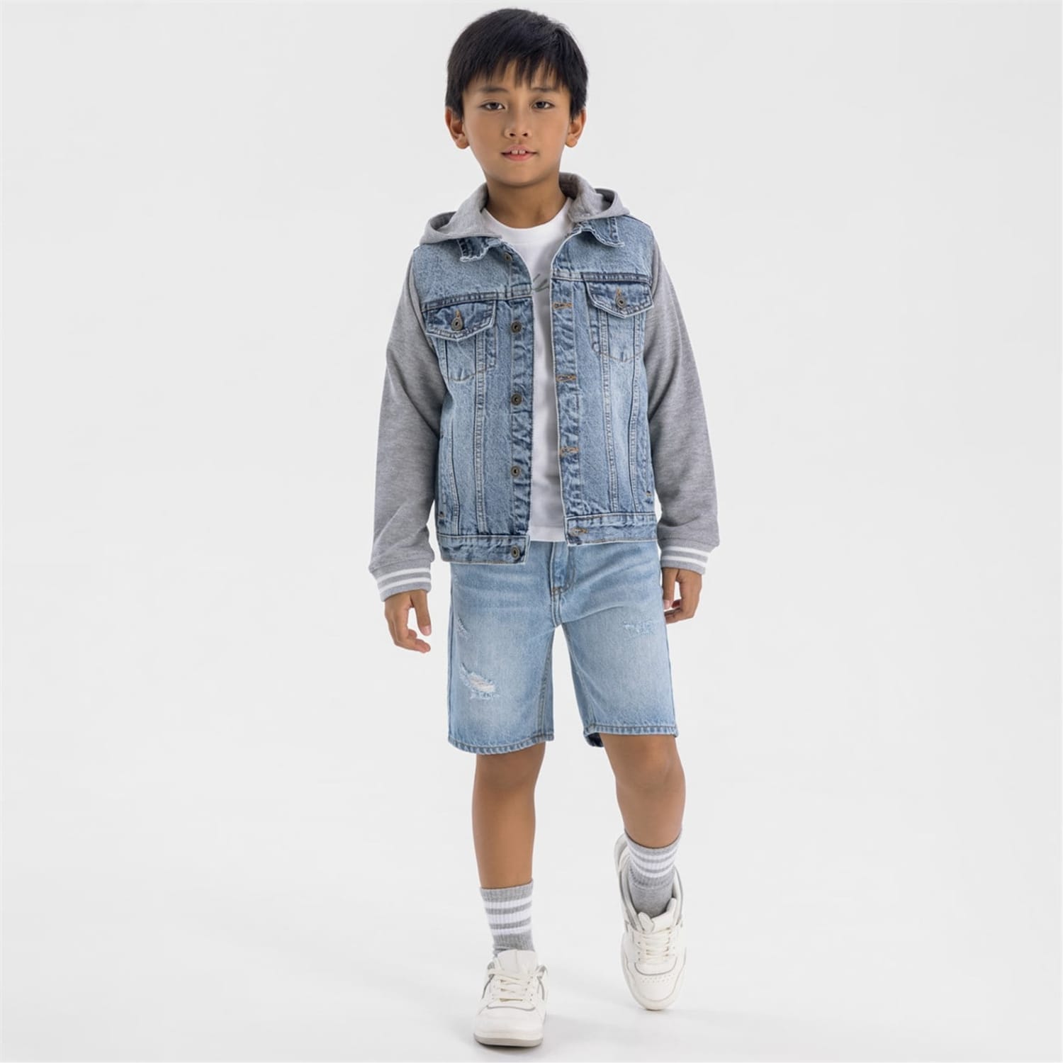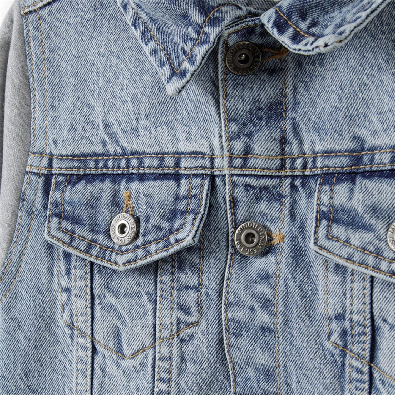 Denim jacket for boys tailored for casual use, presented in a light blue colour. It includes fleece sleeves that enhance warmth and a detachable hood affixed securely to adapt to varied weather conditions. Fastening is achieved through buttons down the front, paired with a traditional collar that maintains a classic silhouette. The jacket features two chest flap pockets alongside two additional side pockets for storage. Ribbed cuffs are included on the sleeves to ensure a snug fit. The interior is lined with soft fleece, contributing to comfort while preserving a lightweight structure ideal for layering during transitional seasons. The combination of denim fabric with fleece and practical design elements reflects a functional garment for everyday wear.