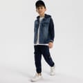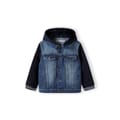 The boys denim jacket is designed for casual wear, featuring a classic navy denim body paired with soft fleece sleeves that provide warmth and allow ease of movement. It includes a traditional collar and a button-up front fastening, ensuring a secure and adjustable fit. Ribbed cuffs at the wrists help maintain fit and comfort. The jacket features a detachable hood that offers adaptable protection against varying weather conditions. Practical storage is provided through two chest flap pockets and two side pockets. The garment maintains a layered appearance without adding bulk, making it suitable for spring and transitional weather. The fit is regular, combining functional construction with style for everyday use.