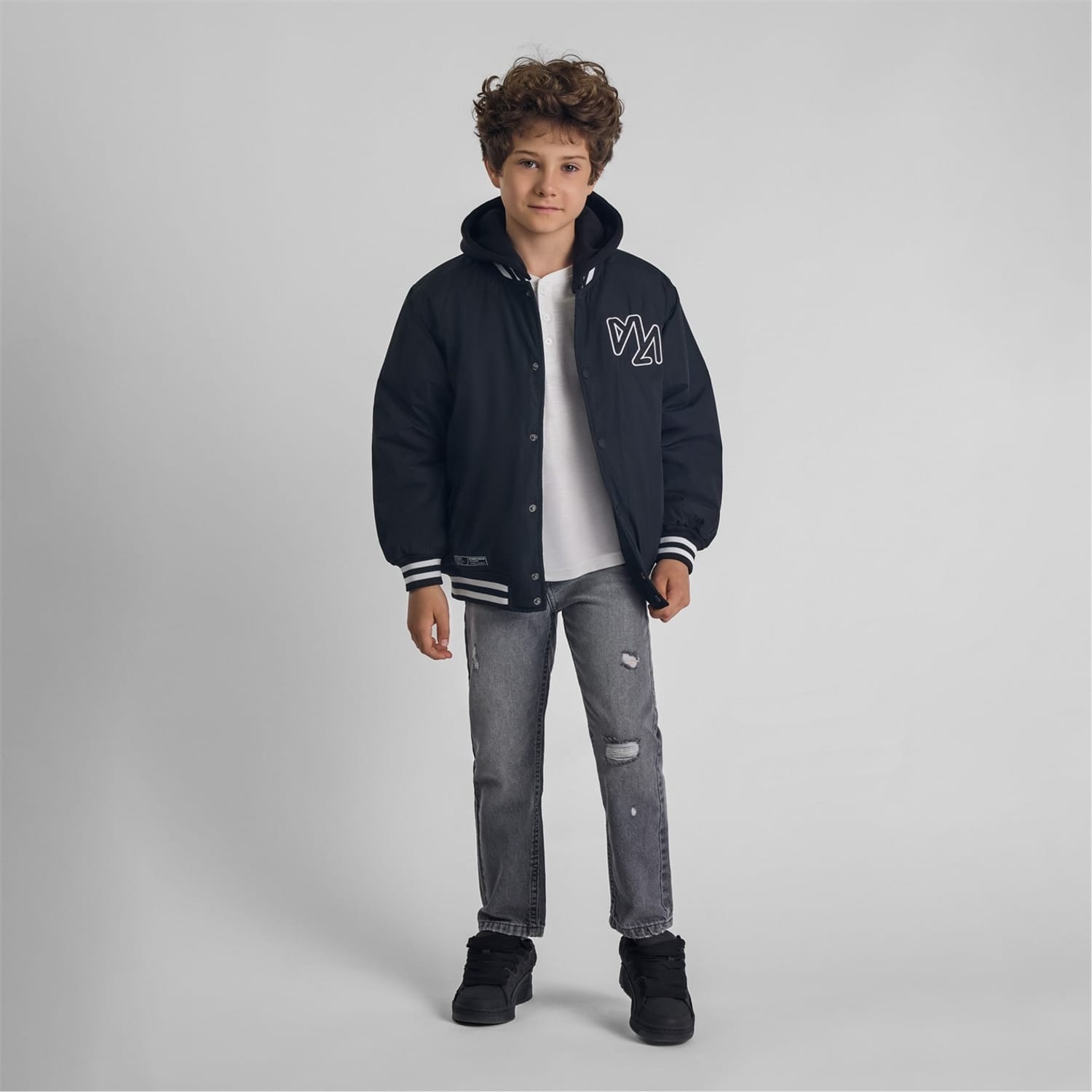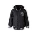 The boys baseball style jacket is a practical outerwear garment designed for boys, suitable for use in moderate weather conditions. It exhibits a classic varsity style characterised by a predominantly black colour with striped ribbed cuffs and a matching waistband that deliver a structured and neat appearance. The detachable hood is made from sweatshirt knit fabric and is secured with buttons. It also features a drawstring, allowing the wearer to adjust the fit precisely. The chest area displays subtle embroidery, providing an understated decorative detail. The jacket includes multiple pockets; these combine zip and snap button closures to ensure small items can be safely stored. The tailored cut promotes ease of movement, rendering it well suited for active use or layering in cooler conditions. No fabric composition information is specified by the manufacturer.