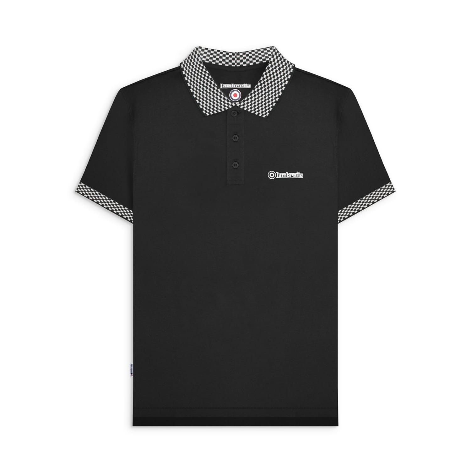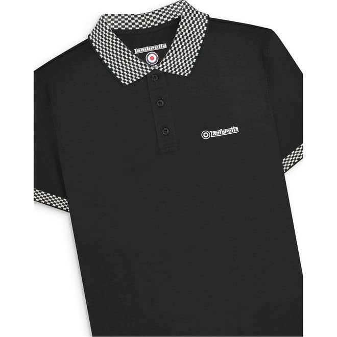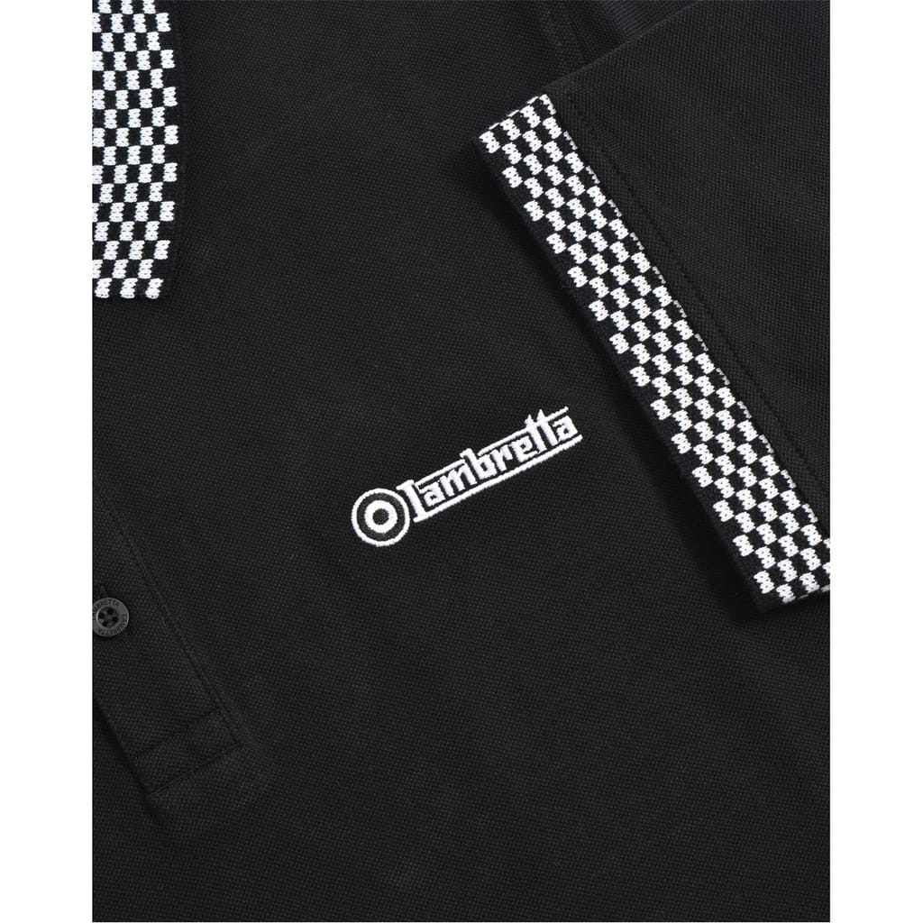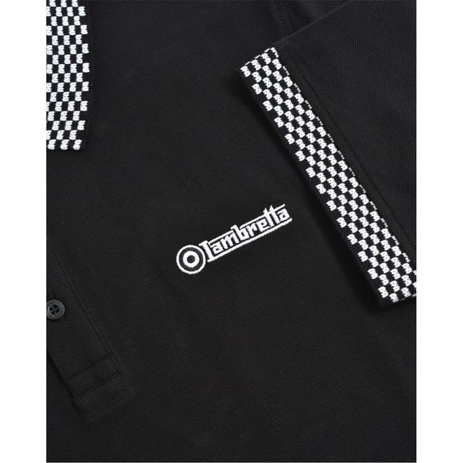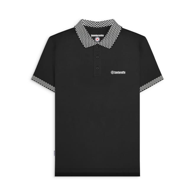 This Lambretta top features a two-tone checkerboard pattern, offering a stylish look. It has a front button closure and a polo collar, complemented by short sleeves with knitted cuffs. The regular fit ensures comfort, while the straight hem adds a neat finish. Embellishments include an embroidered logo and contrast detail, along with a logo tab for added brand recognition. -