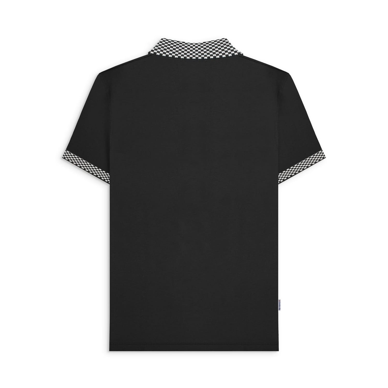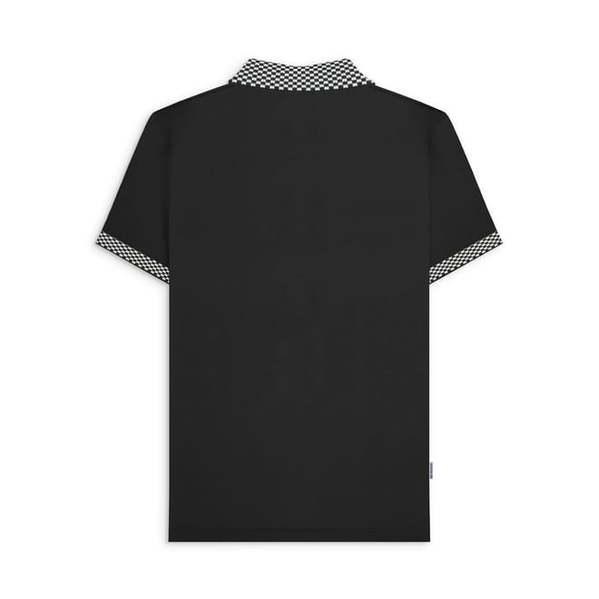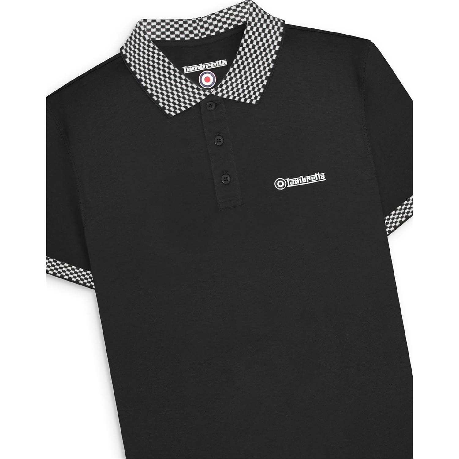 This Lambretta top features a two-tone checkerboard pattern, offering a stylish look. It has a front button closure and a polo collar, complemented by short sleeves with knitted cuffs. The regular fit ensures comfort, while the straight hem adds a neat finish. Embellishments include an embroidered logo and contrast detail, along with a logo tab for added brand recognition. -