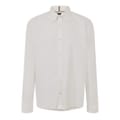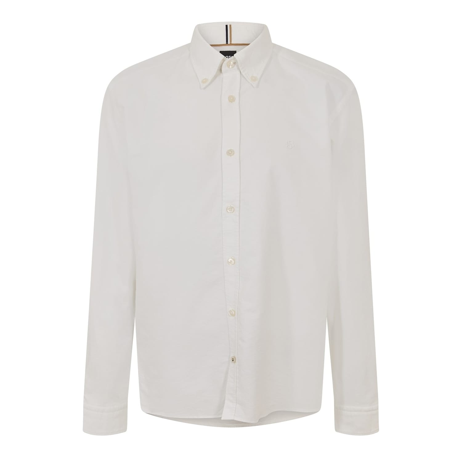 The Boss Liam top is a sophisticated choice for any wardrobe. This long-sleeve piece features a full button closure and a regular fit, ensuring comfort and style. The shirt sleeve design is complemented by a barrel cuff and a curved hem. A solid pattern with an embroidered logo adds a touch of elegance to this classic top. -