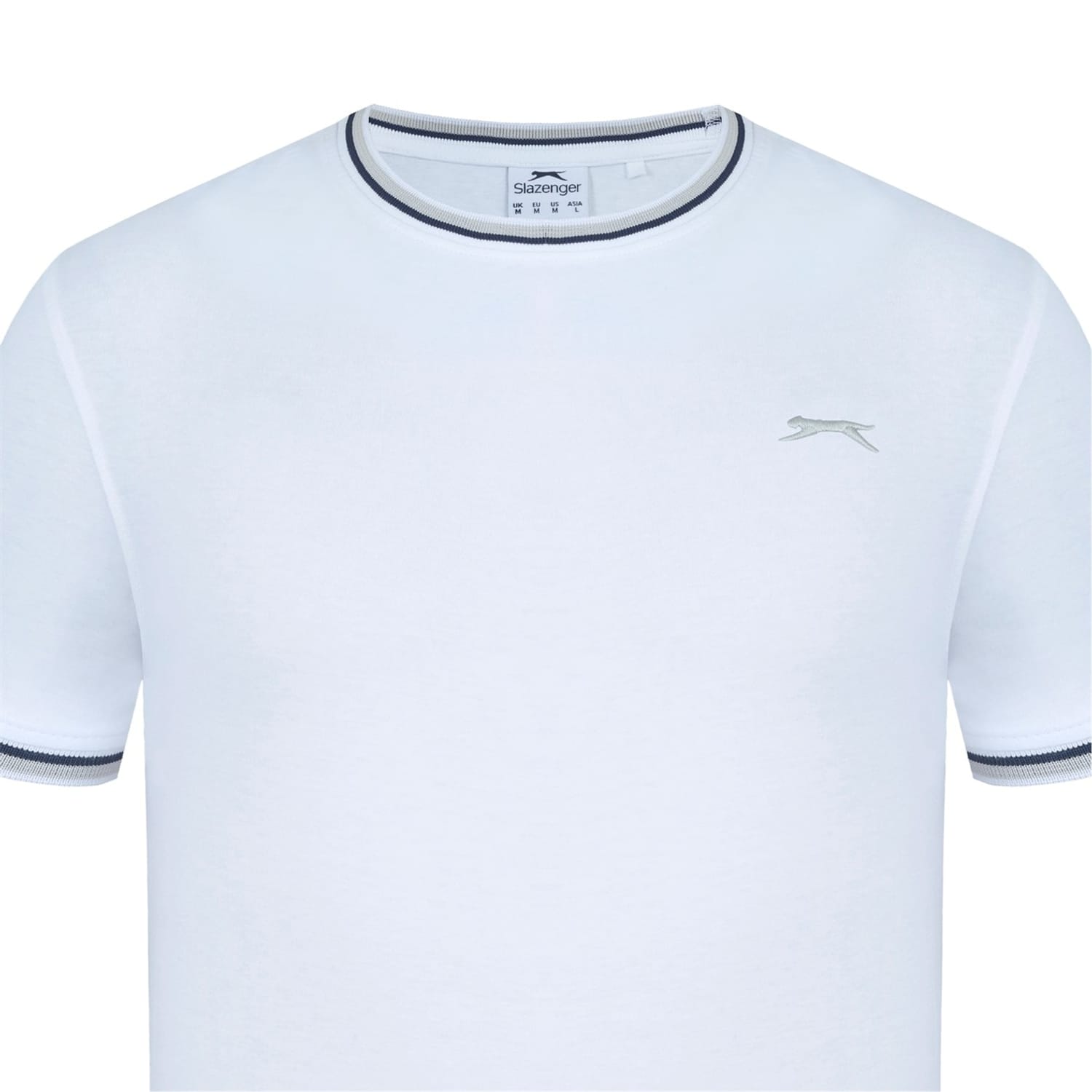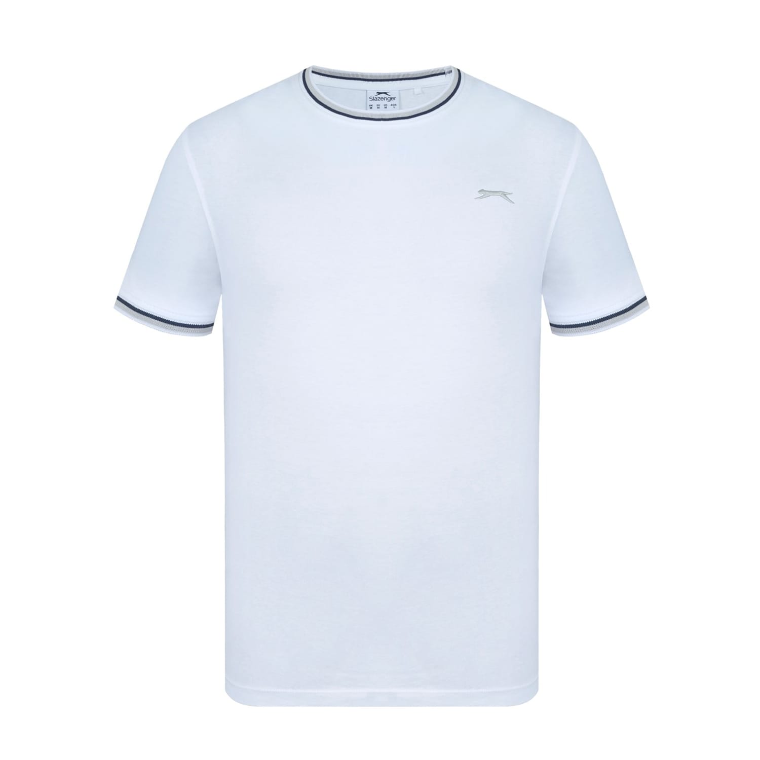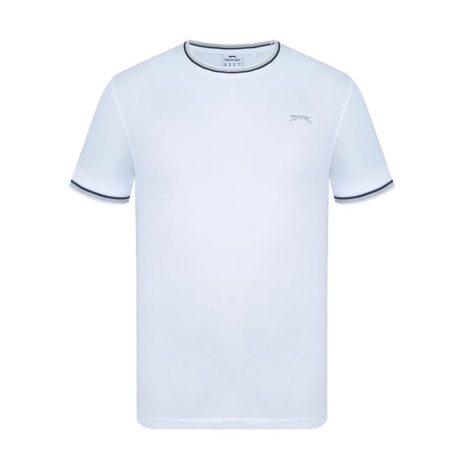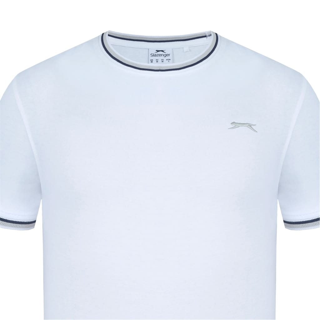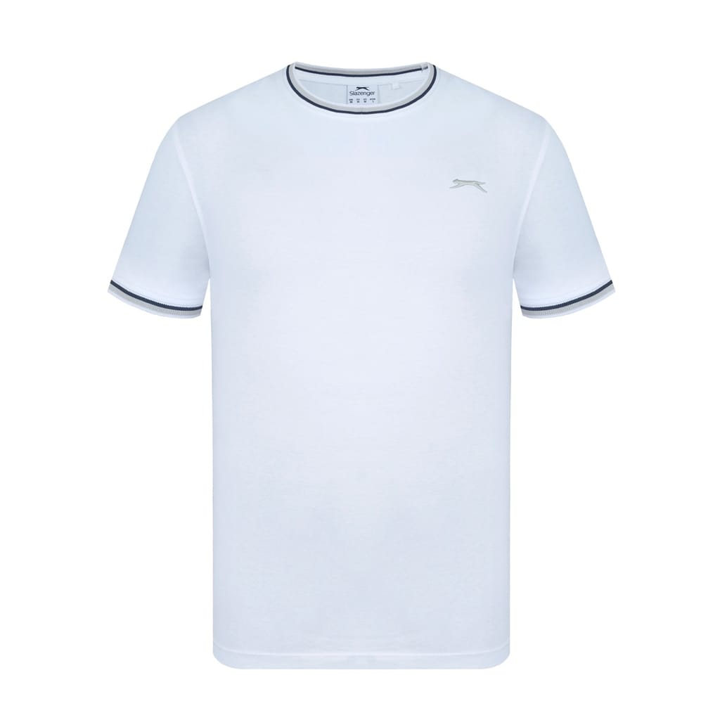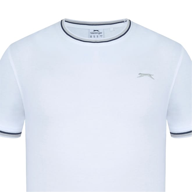- This Slazenger Tipped T Shirt features short sleeves with a ribbed cuff with tipping for a colour pop. Tipped crew neckline with tipping for a classic look. Comfortable fit and is a lightweight construction. This t shirt is designed with an embroidered 3D logo to the chest for signature Slazenger branding.