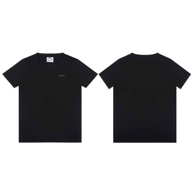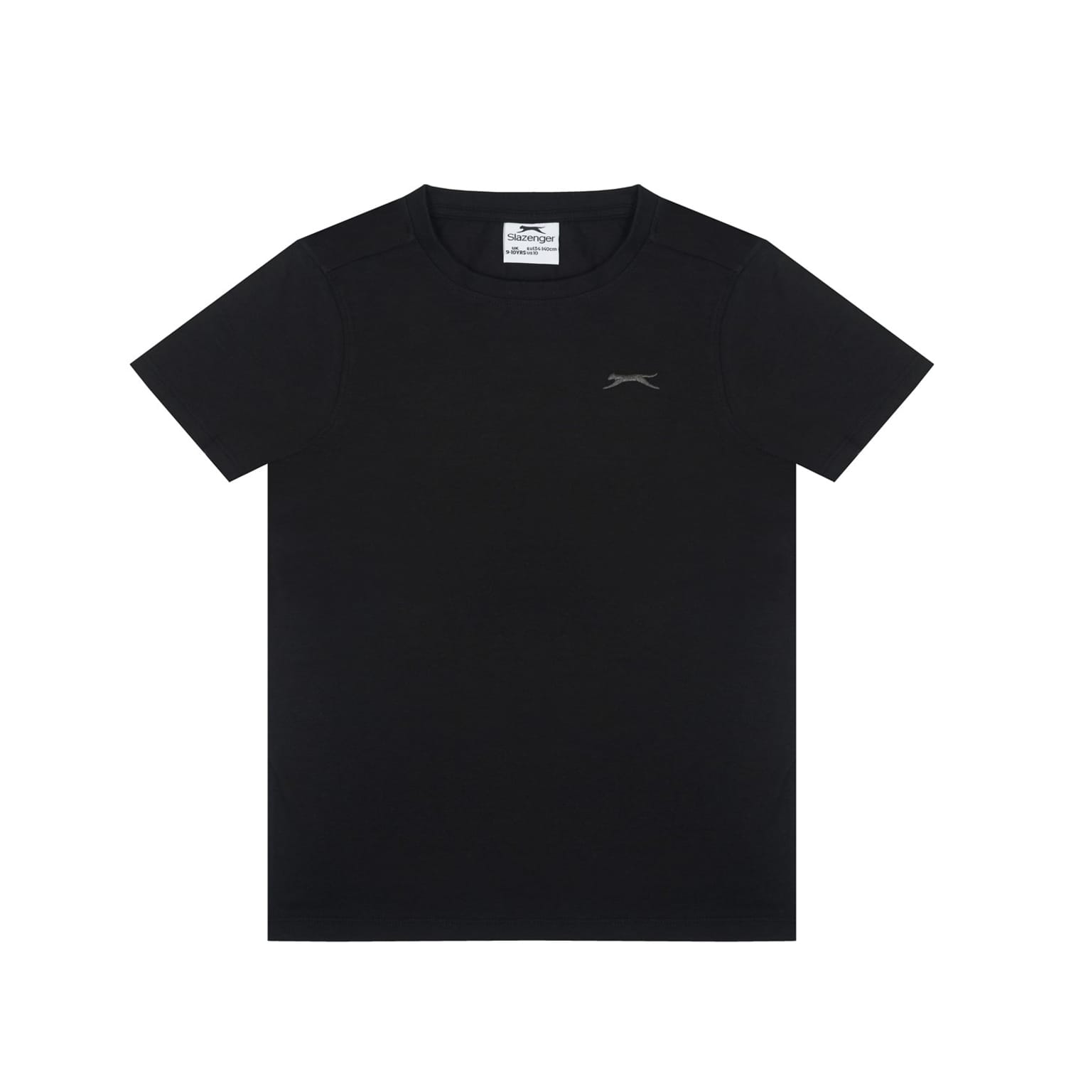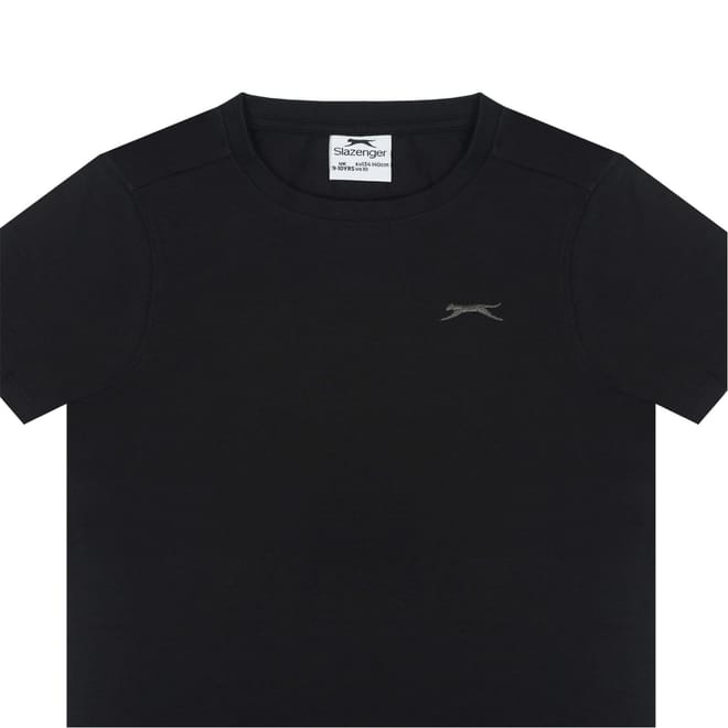 - Sport a casual everyday look with this Slazenger Plain T Shirt. Constructed with a ribbed crew neck and short sleeves for a casually classic look, this staple tee can be worn for leisure, sport or lounging around at home. The Slazenger logo is embroidered on the chest for brand recognition and block colour throughout for a simple and minimal aesthetic.