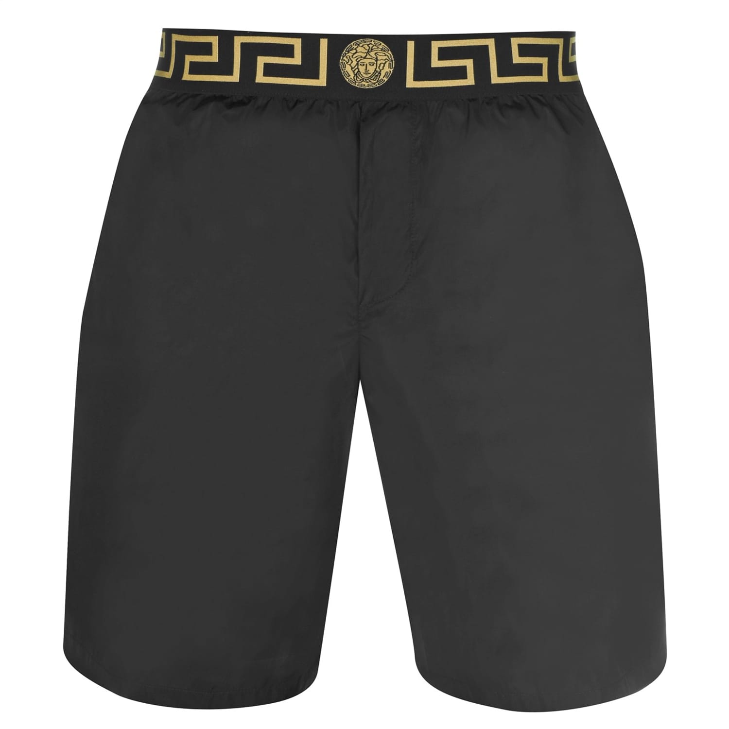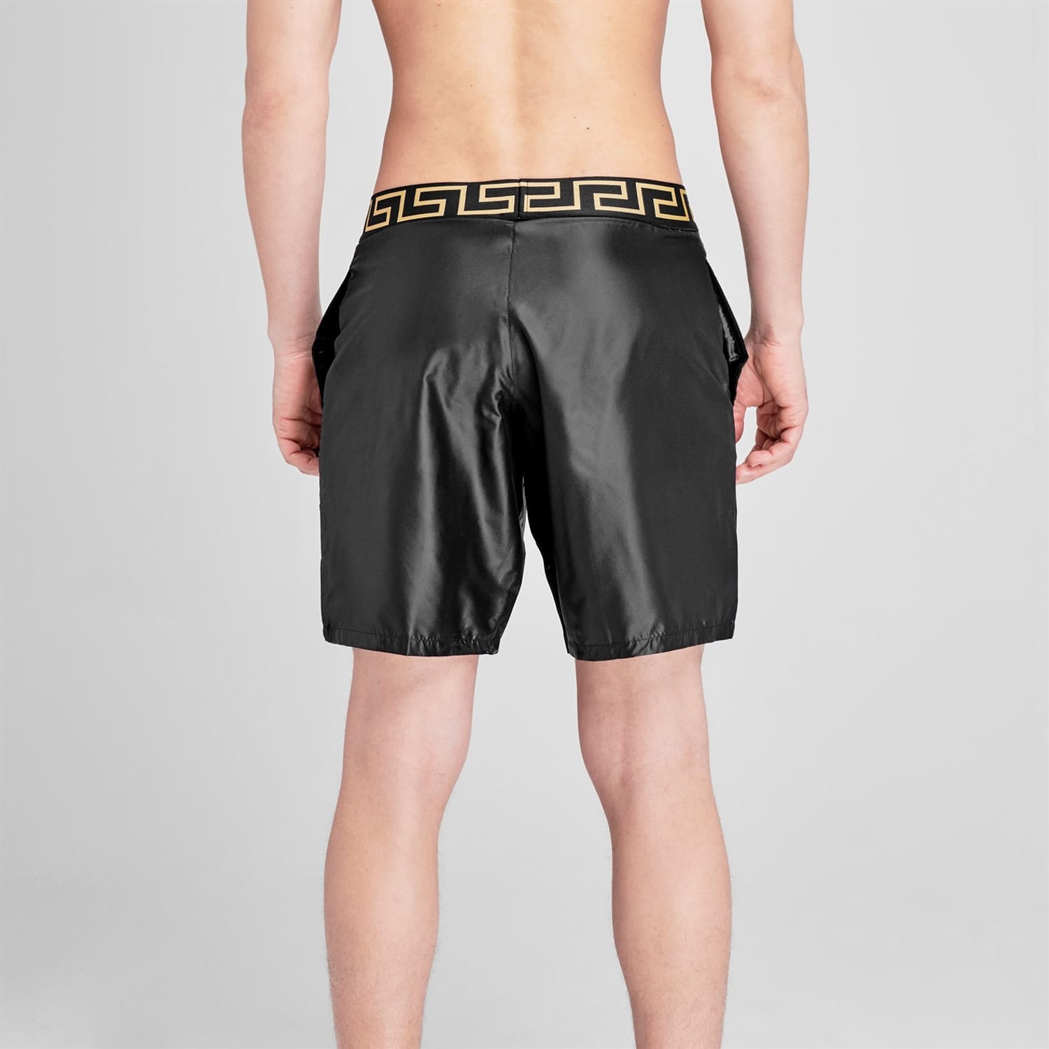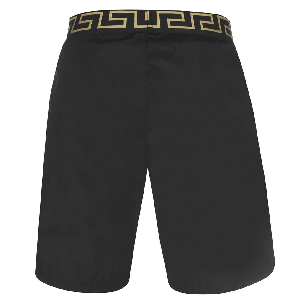 - Crafted from high-quality nylon, these swim shorts boast a regular fit, combining comfort and style for the modern luxury consumer. Featuring a mid-rise and an elasticated waistband, these swim shorts ensure a flattering and comfortable fit. The above-the-knee length adds a touch of refinement, making them suitable for poolside lounging and beach getaways. With two side slip pockets, you can conveniently carry your essentials, allowing you to transition from a dip in the crystal-clear waters to sipping cocktails by the poolside. A standout feature of these swim shorts is the Greca weave design that adorns the waistband. This intricate pattern, a signature of the Versace brand, adds a touch of elegance and exclusivity to the overall design. Immerse yourself in a world of limitless luxury as you showcase your impeccabl -