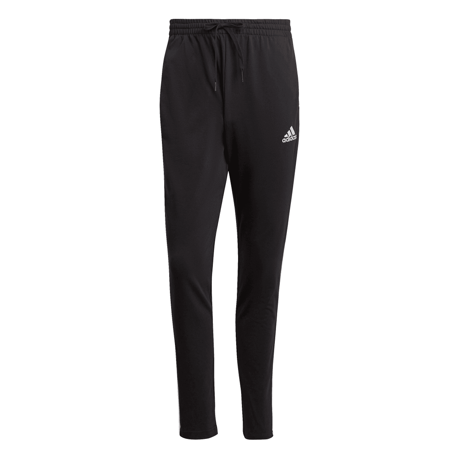 "Stripes for life. Wear these adidas essential pants to show your connection to a global community. Their single jersey cotton blend delivers a soft feel whether you're walking the dog, kicking a ball at the park or barbecuing in the backyard. Moisture-absorbing AEROREADY keeps you dry. Our cotton products support sustainable cotton farming. This product is also made with recycled content as part of our ambition to end plastic waste." -