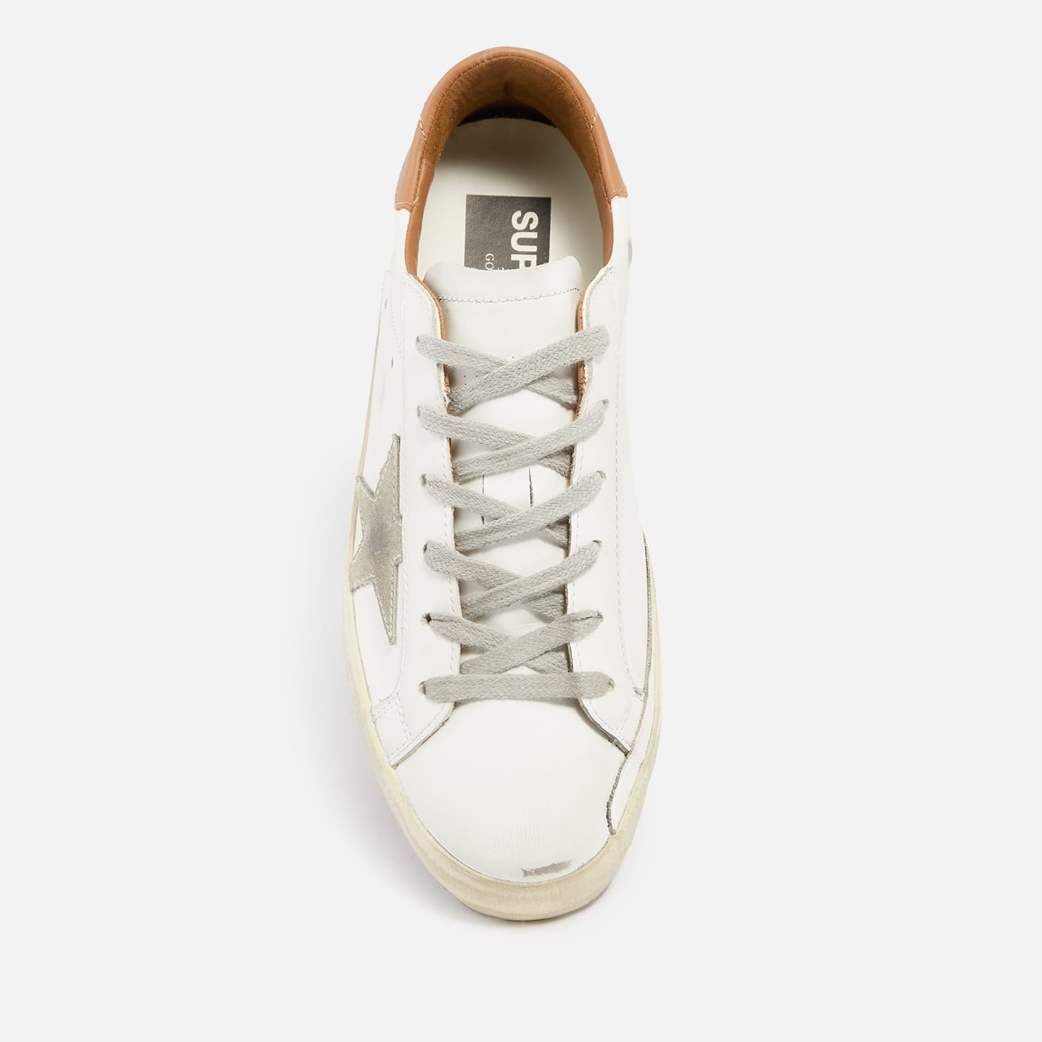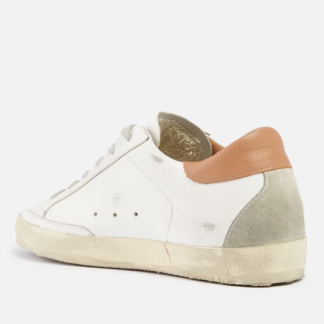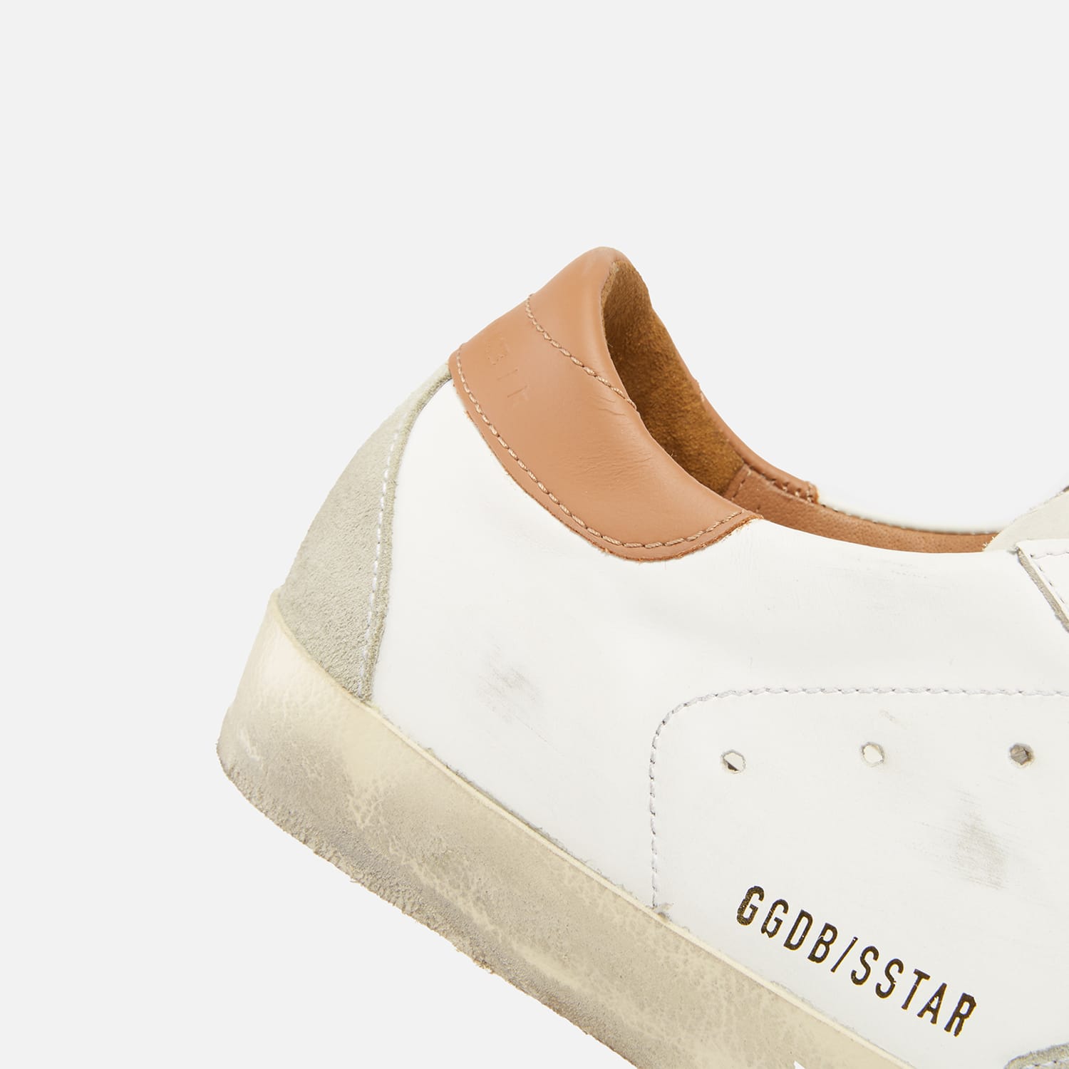 The sneakers often feature a signature star patch on the side and a worn-in appearance, which is achieved through a variety of hand-finishing techniques. The specific model in the image is a low-top version with a white leather upper, a gray suede star, and a tan leather heel tab. The text "GGDB/SSTAR" is a branding detail on the side of the shoe. -
