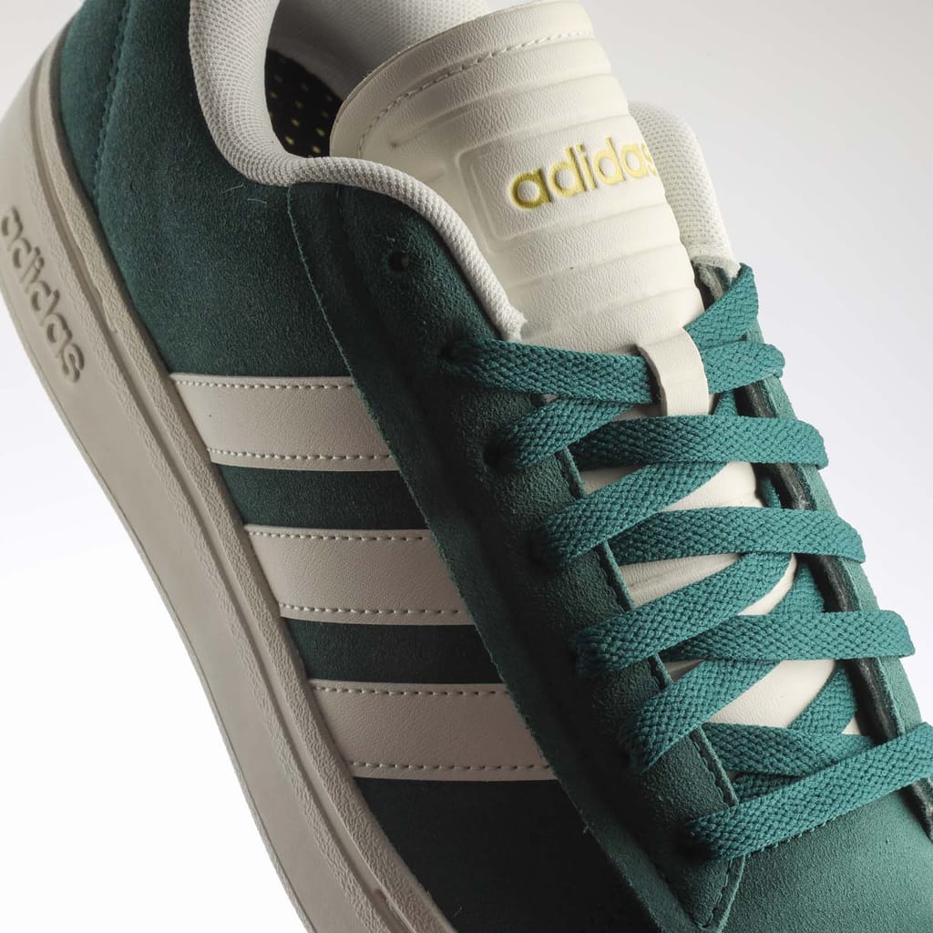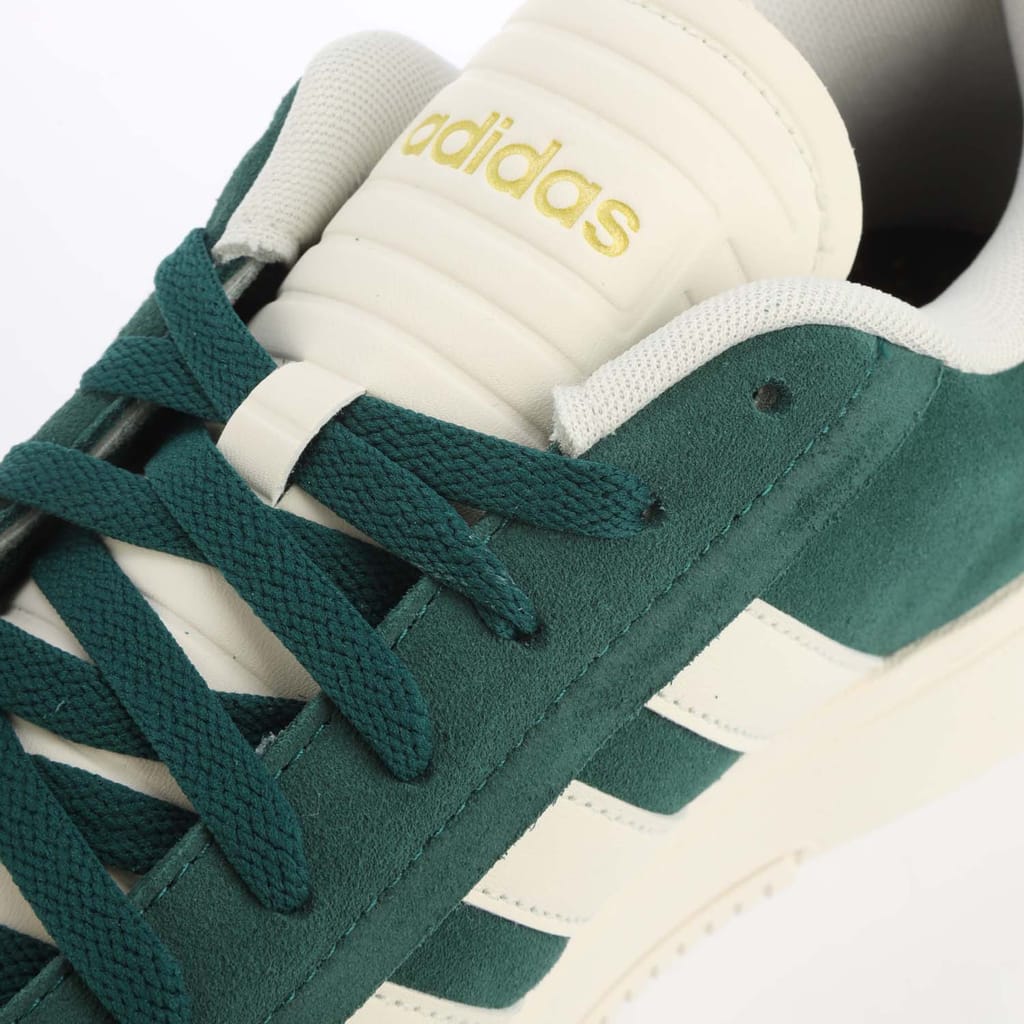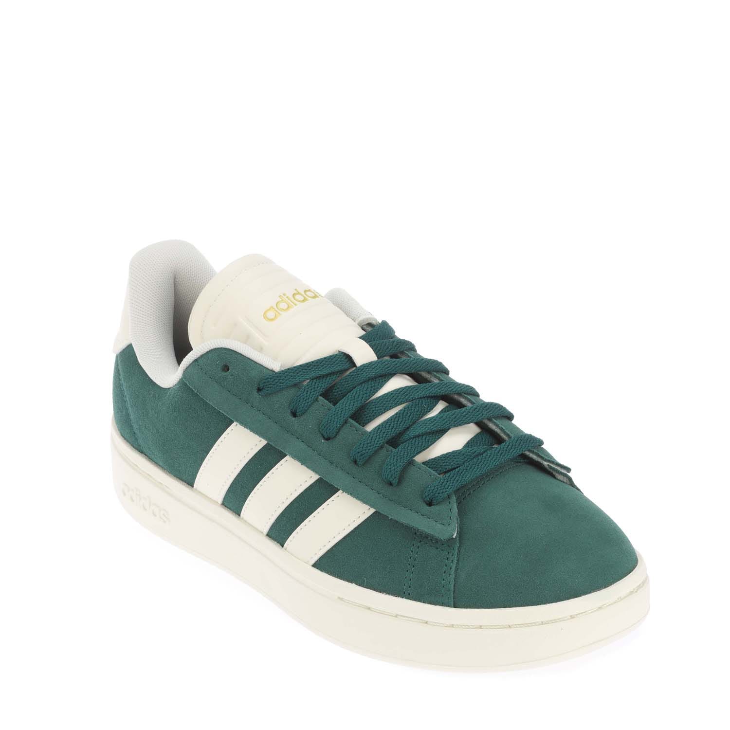 Mens adidas Grand Court Alpha Shoes in collegiate green / off white / gold metallic.