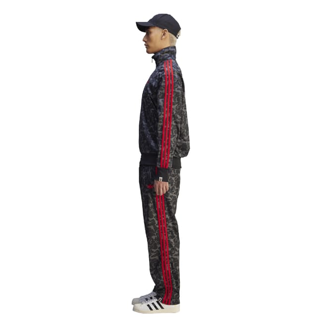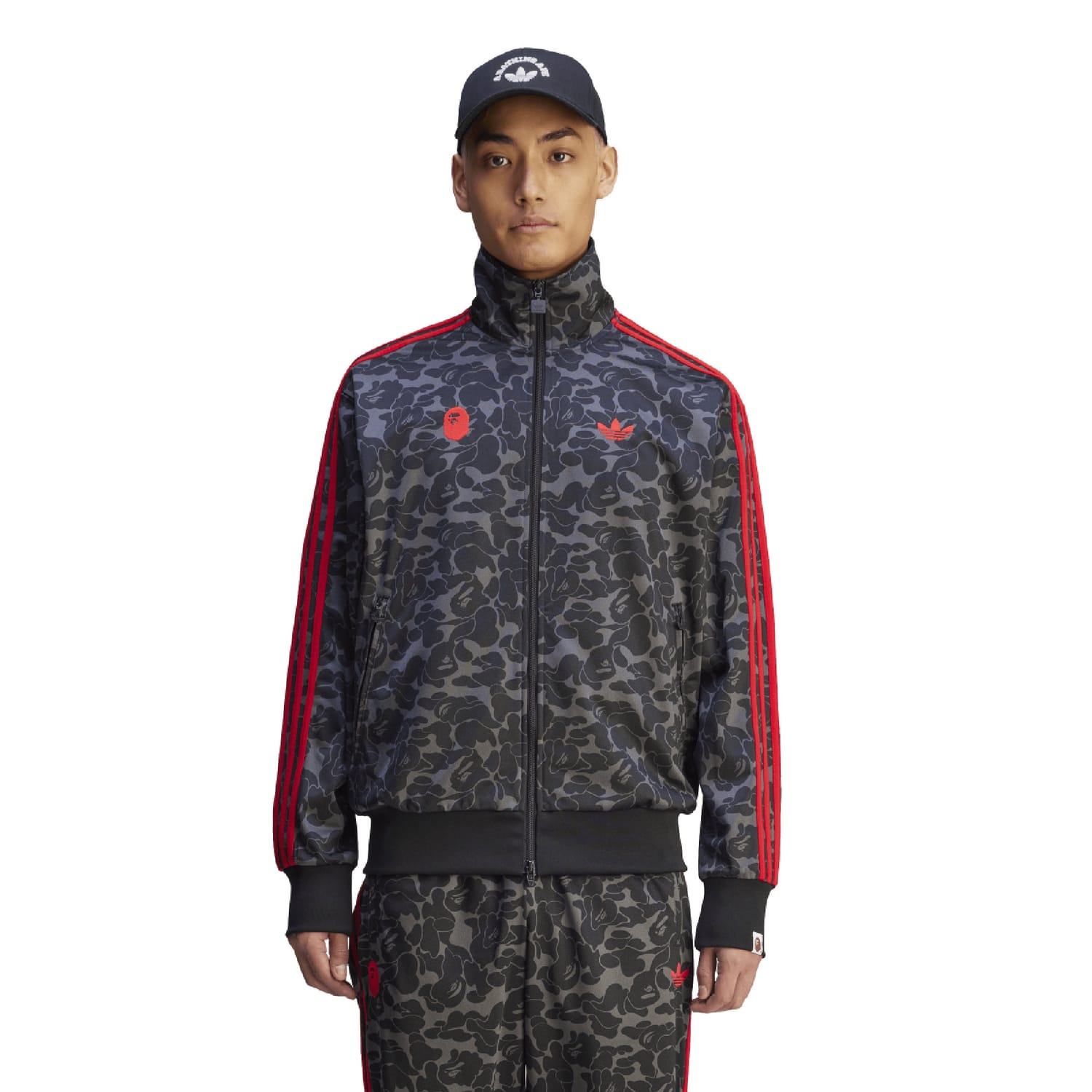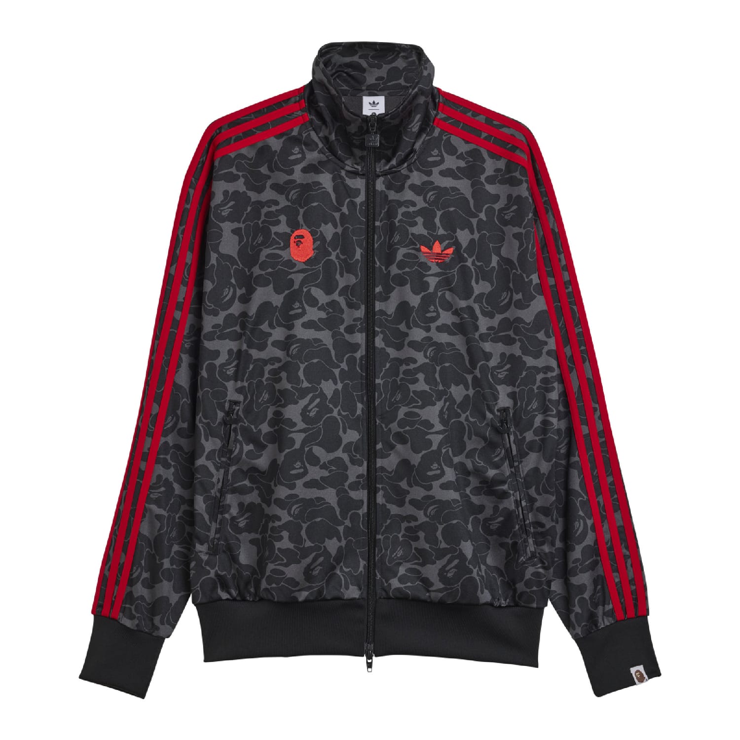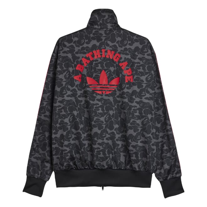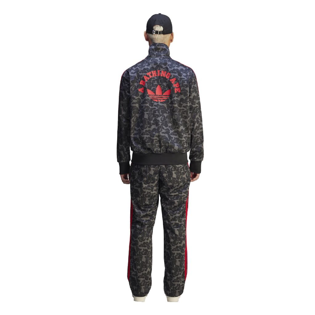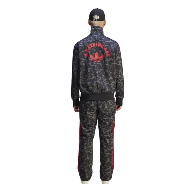 adidas x A Bathing Ape revisit some of culture's most impactful moments to inform this adidas track jacket. Inspired by a landmark time in '80s hip-hop and infused with adidas Originals blue, the jacket also gets done up with the BAPE® solid camo allover print. Graphics and branding can be found throughout — 3-Stripes on the sleeves and Ape Head and Trefoil sign-offs on the upper legs. -