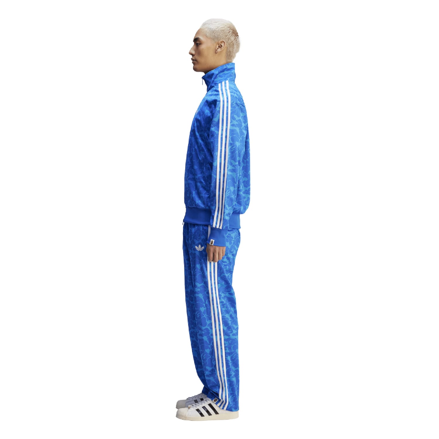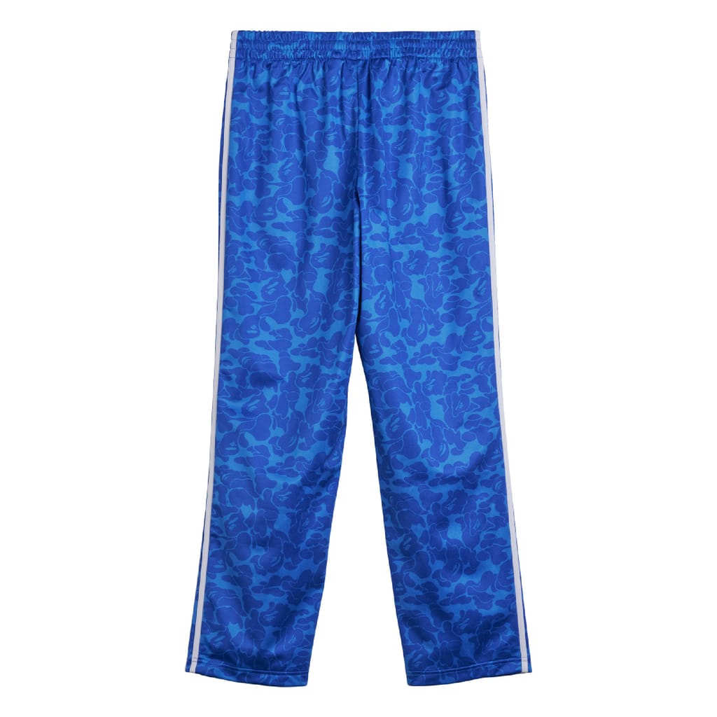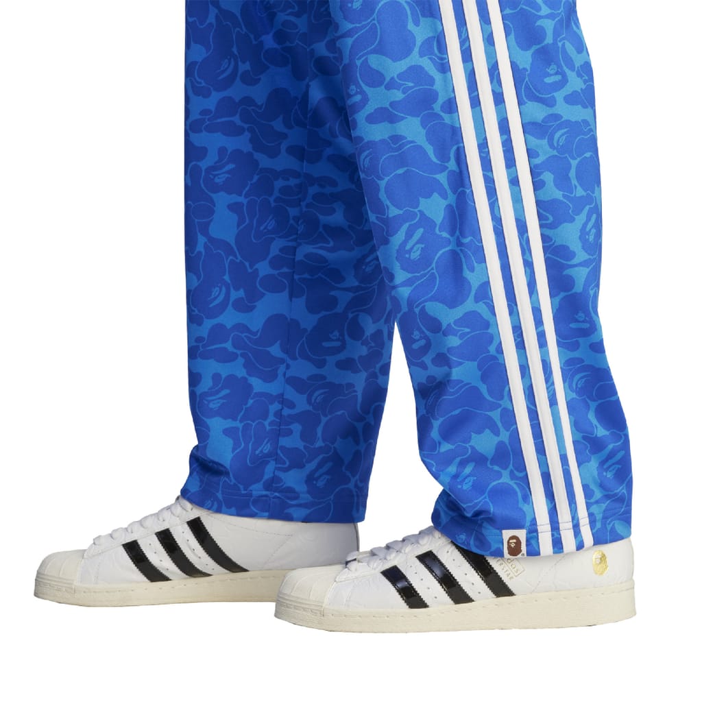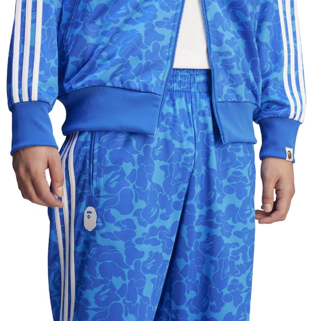 adidas x A Bathing Ape revisit some of culture's most impactful moments to inform these adidas track pants. Inspired by a landmark time in '80s hip-hop and infused with adidas Originals blue, the jacket also gets done up with a BAPE® solid camo allover print. Graphics and branding can be found throughout — 3-Stripes on the side, a special print on the back and Ape Head and Trefoil sign-offs on the chest. -