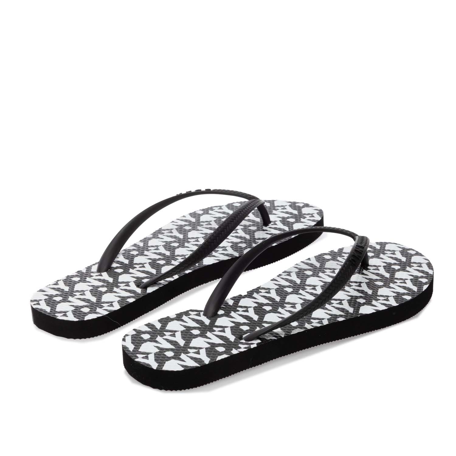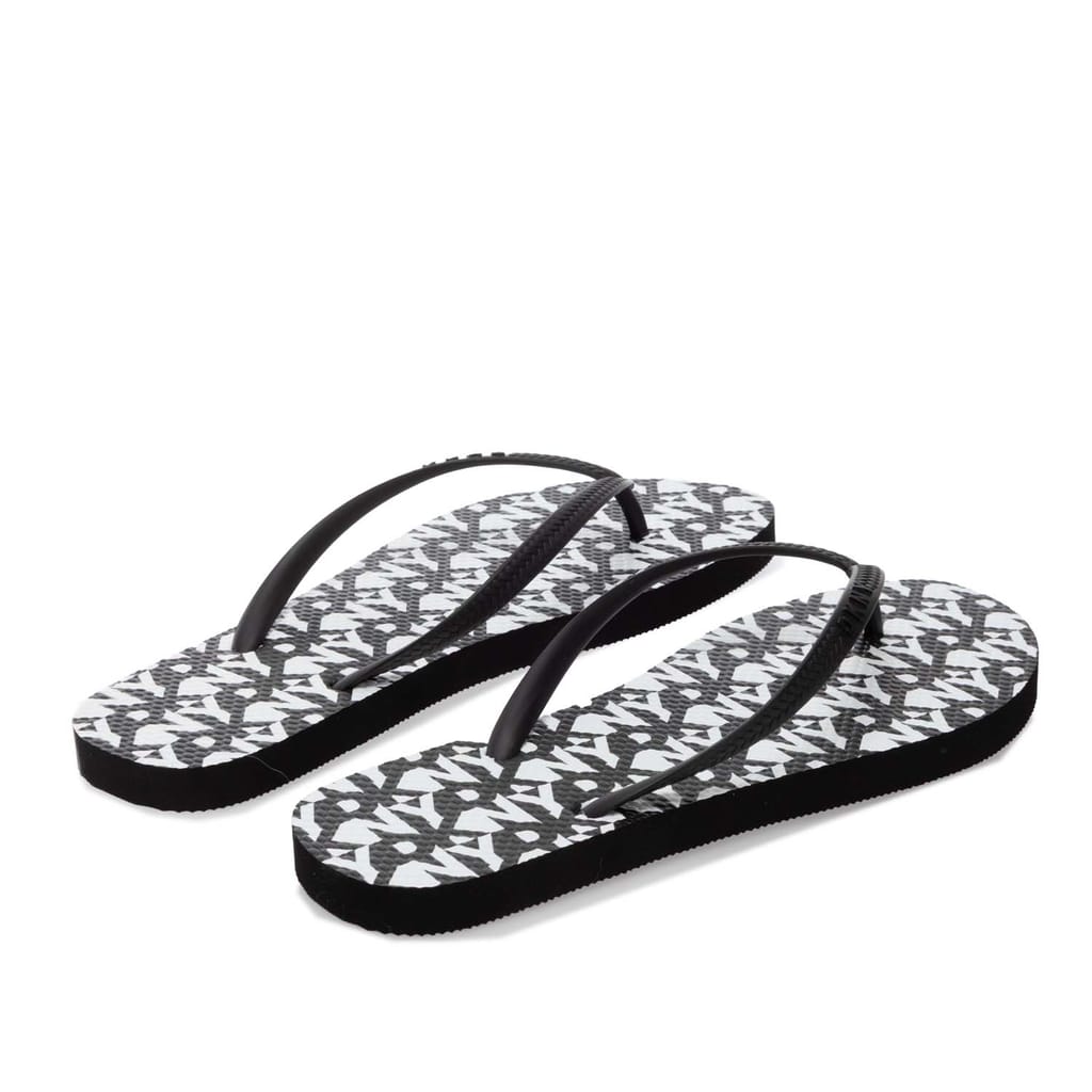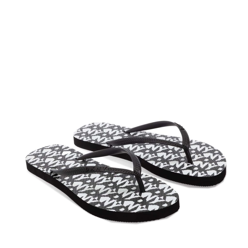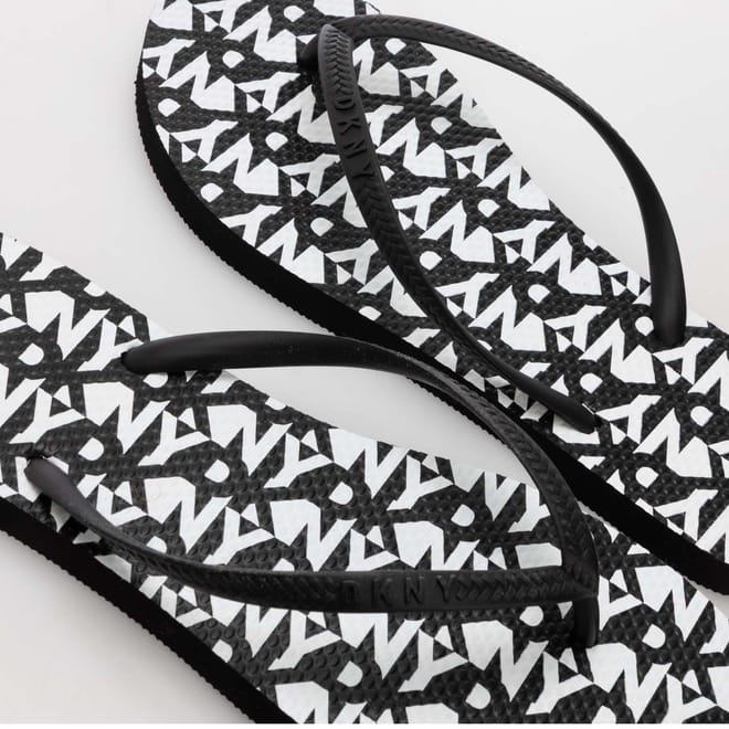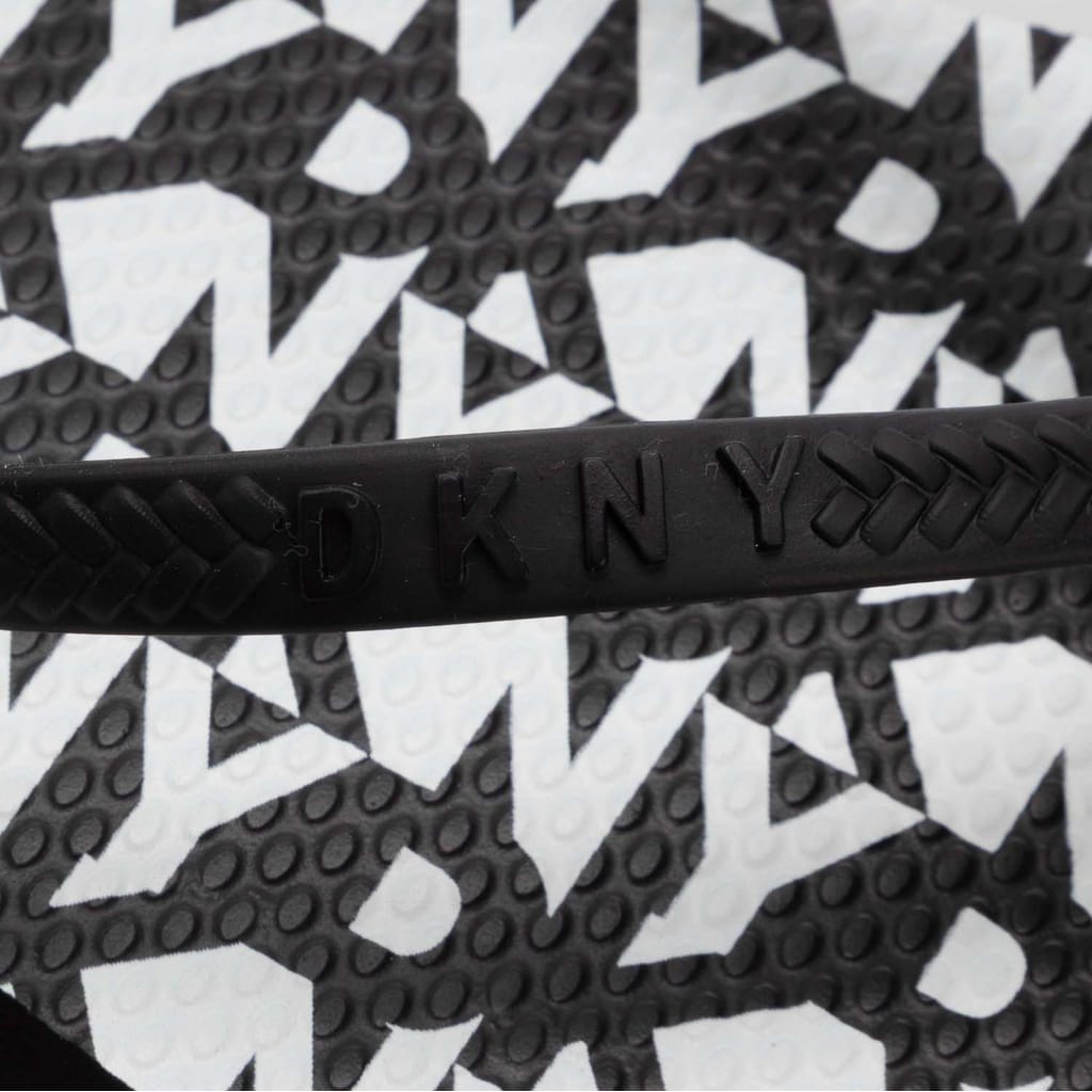 DKNY Susan Flip Flops are a type of sandal that features a flat heel and a slip-on design. The sandals have a synthetic upper, lining, and sole, with a cushioned footbed for comfort. They are identified by the DKNY logo that is embossed on the strap and printed on the insole. -