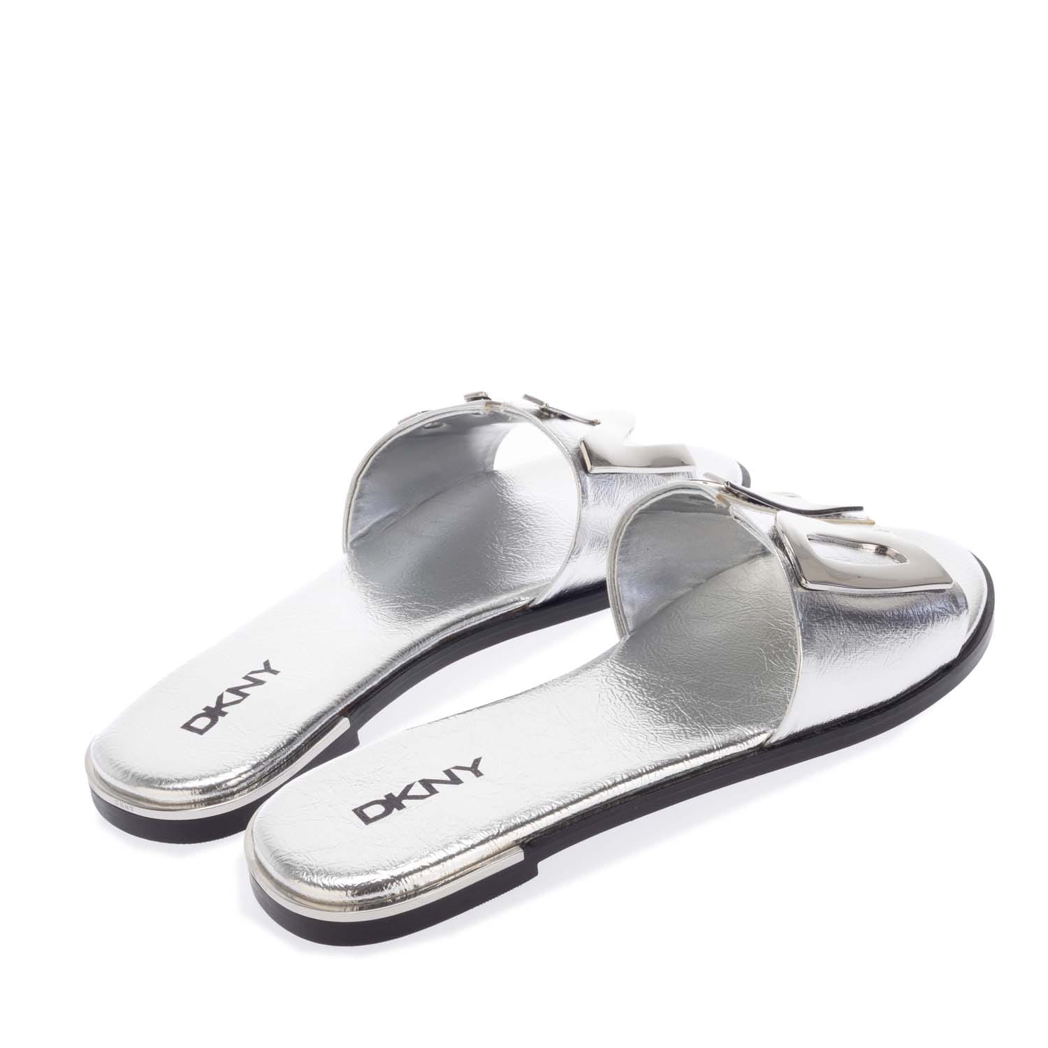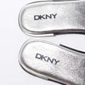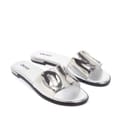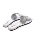 3/8" heel Round-toe slip-on sandals Oversized initial insignia and clear inset strip at vamp band; metallic heel rand Manmade upper; manmade lining; manmade sole -