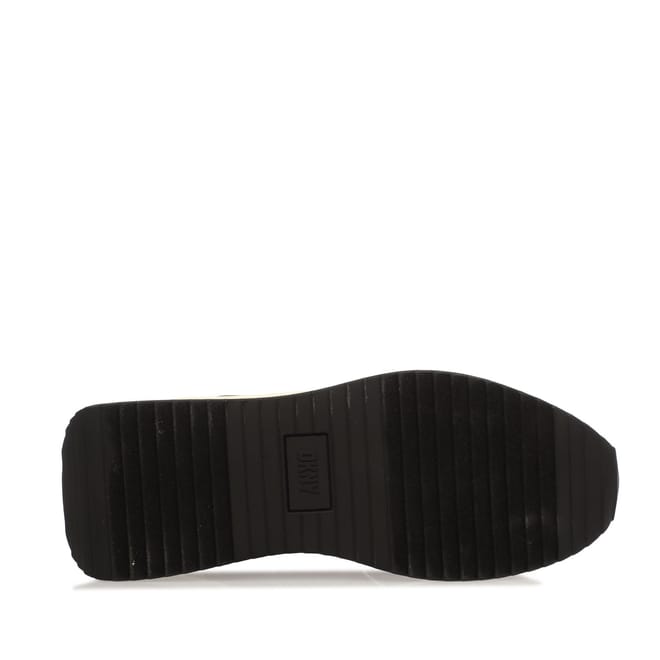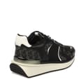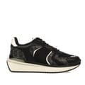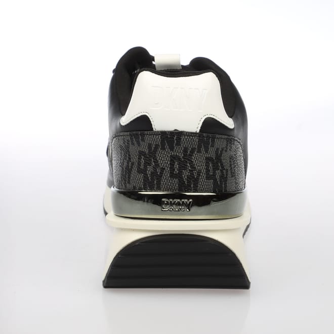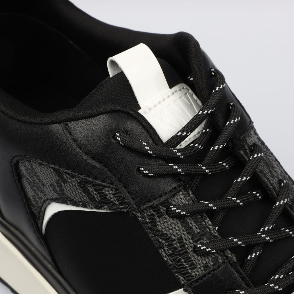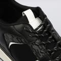 Black upper with a textured, patterned, material and white, curved accents on the sides. Lace up fastening. Metallic silver detail on the heel. Thick,white rubber sole. -