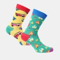 - Ribbed. Yellow Pair: Features a yellow base, a red cuff, blue toe, and red heel, covered in colorful car patterns. Green Pair: Features a green base, blue cuff, purple toe, and red heel, with various flame patterns.