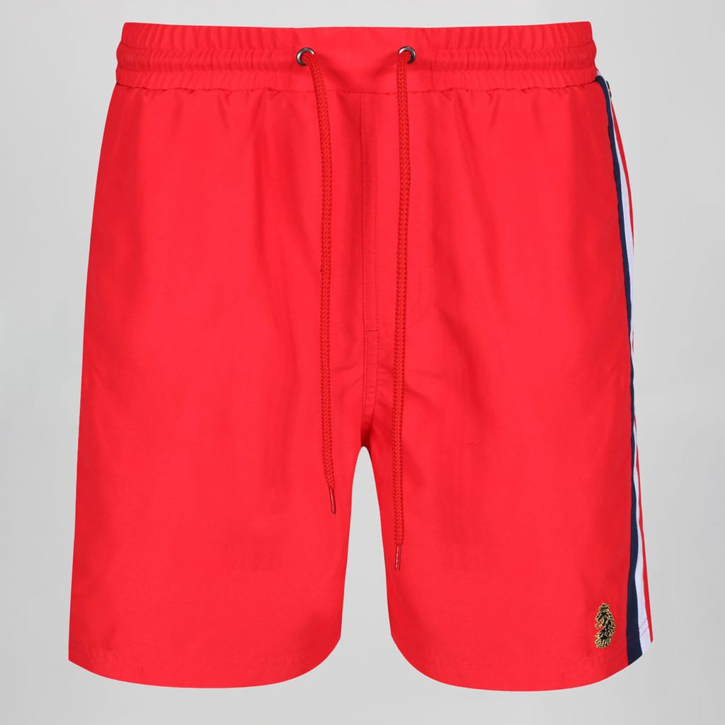"Get poolside-ready in this pair of swim trunks from LUKE. Cut from a quick-drying polyester, these shorts are detailed with contrast stripe panels and the brands iconic lion head on the left leg. The mesh interior provides a breathable fit.