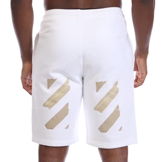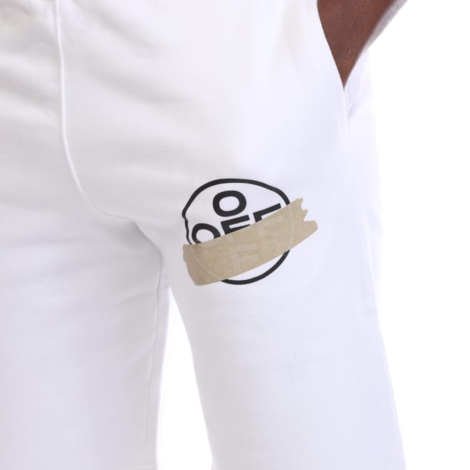 - Brand's signature 'OFF' circle logo on the leg, which is covered by a beige "tape" motif.