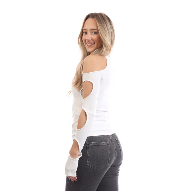 Womens Off White Sleek Holes Long Sleeve Top in white black.
