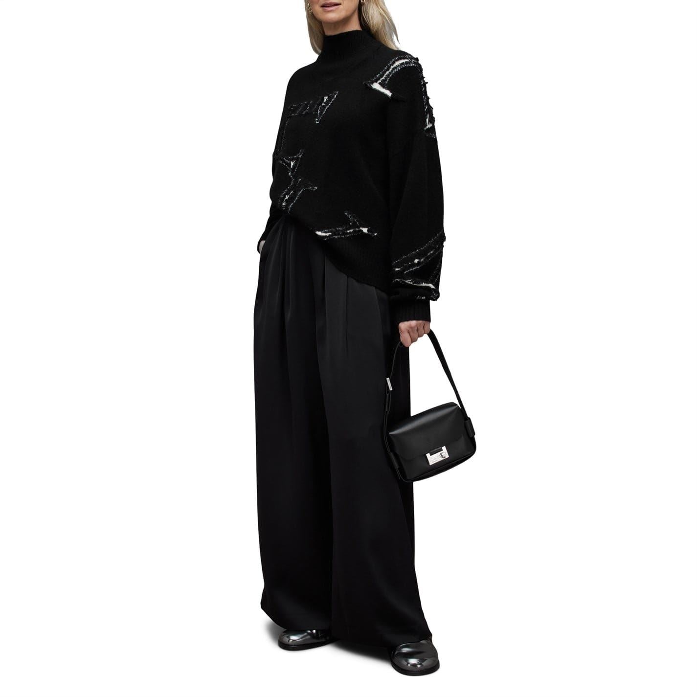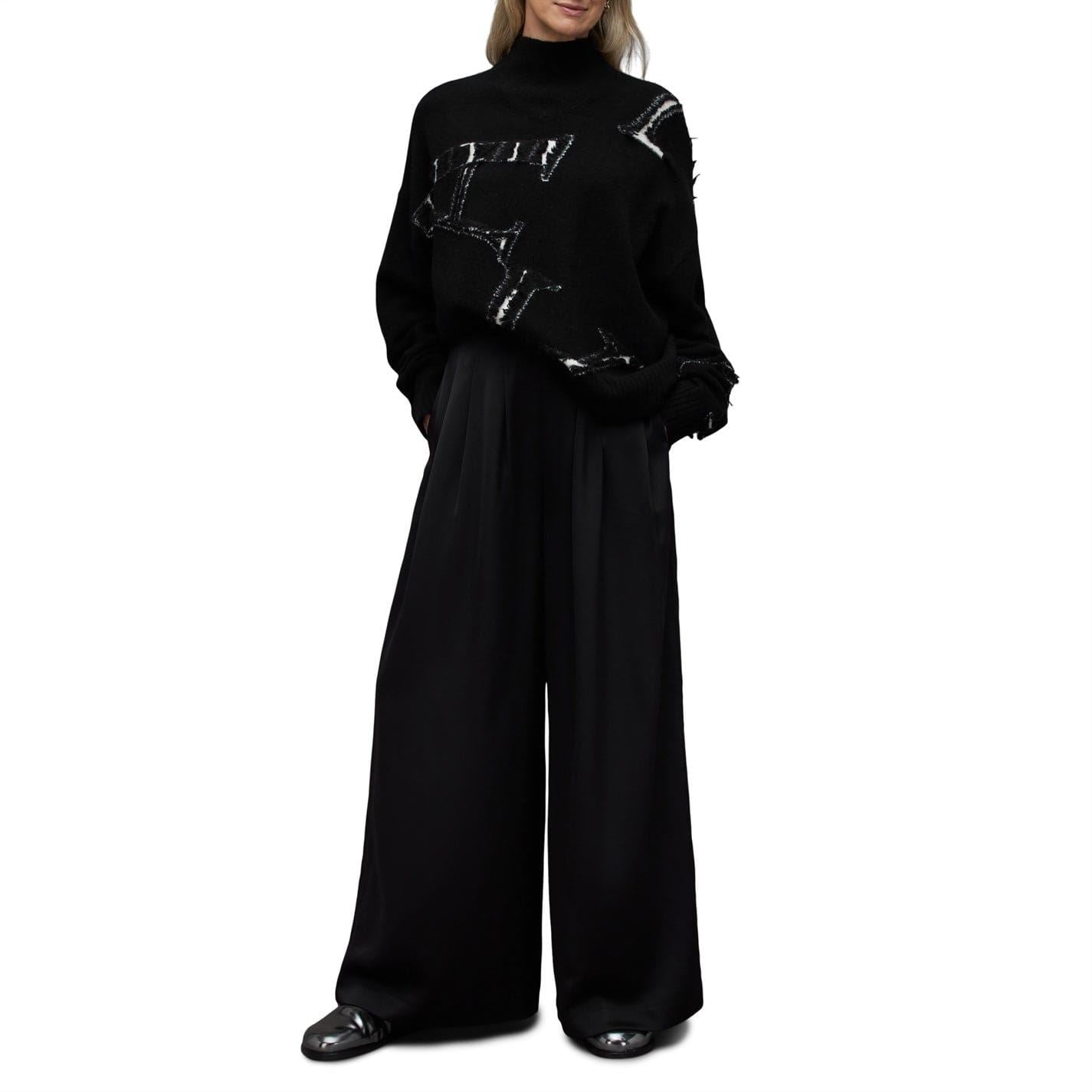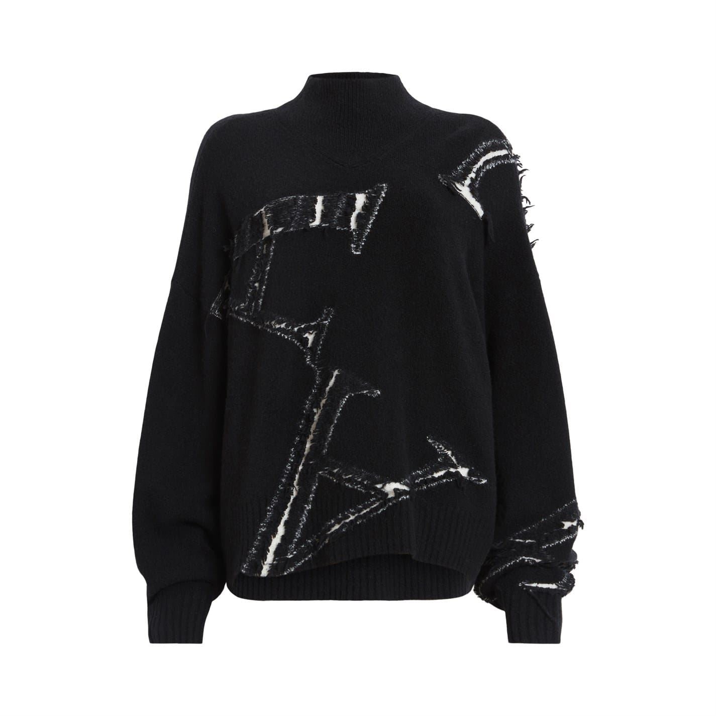 This All Saints sweater features a relaxed fit with long sleeves and a mock neck. Crafted with a knit texture, it showcases a graphic print and a subtle logo embellishment. The ribbed cuffs add a touch of detail, making it a stylish choice for everyday wear.