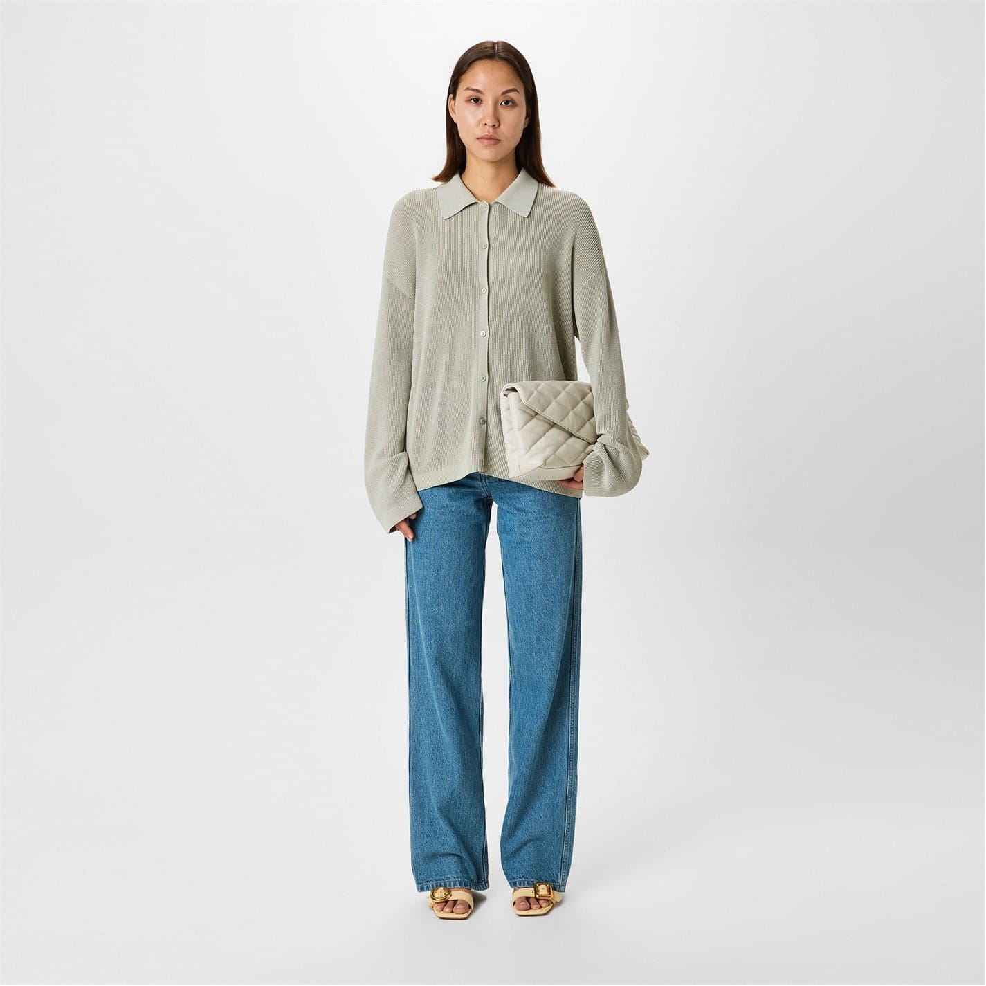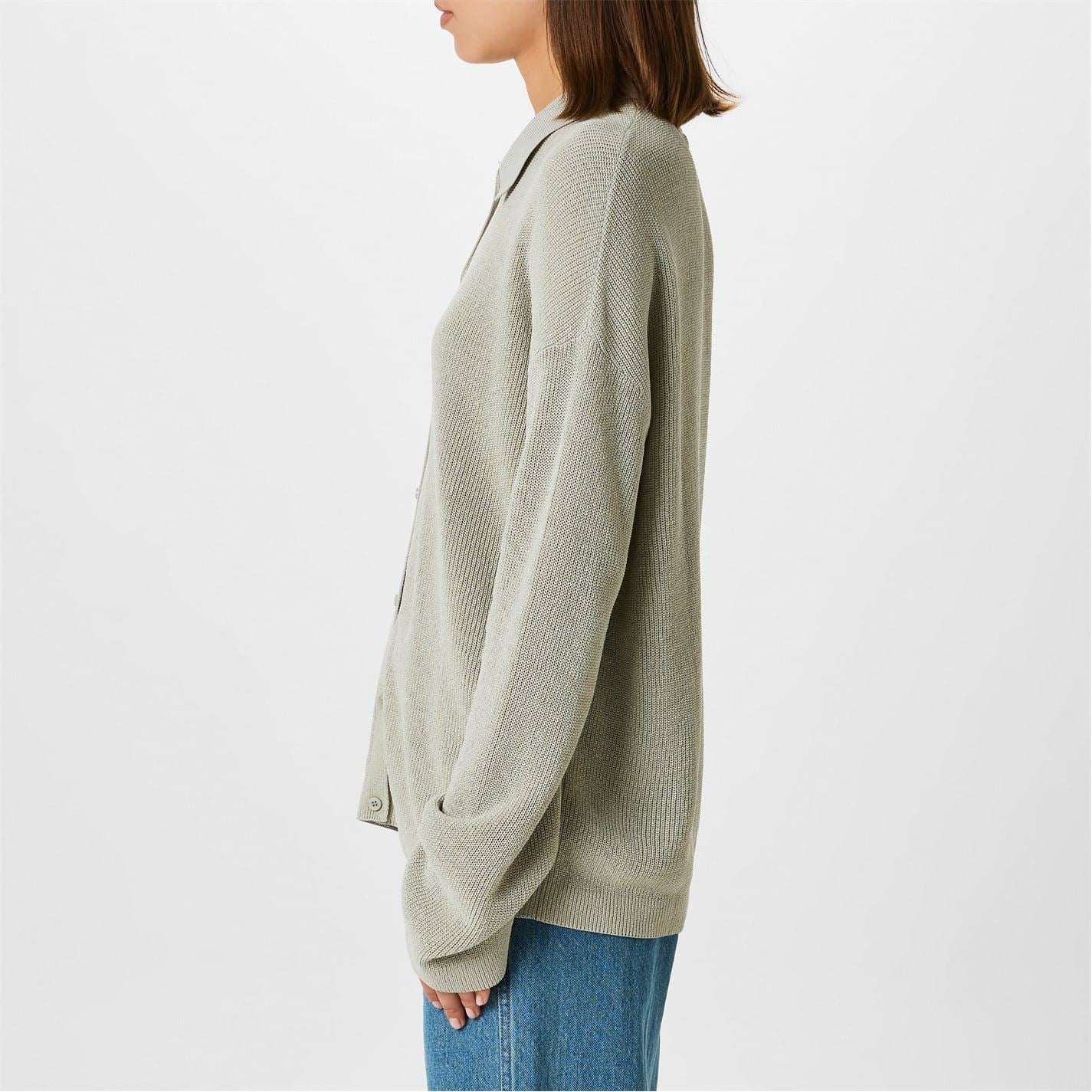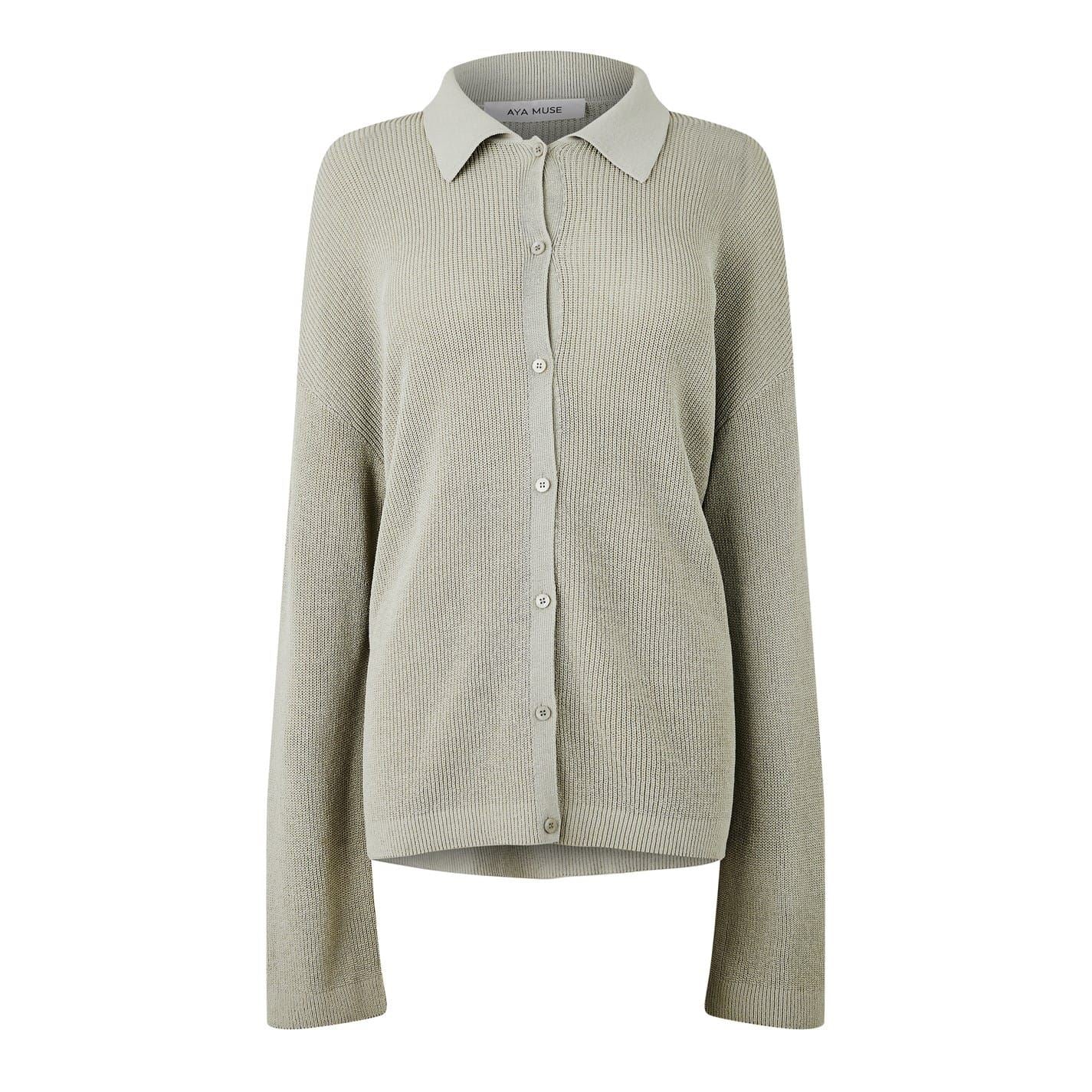 Discover Aya Muse cardigan sweater, a sophisticated addition to your wardrobe. This piece features a button closure and a relaxed fit, perfect for comfort and style. The long sleeves with drop shoulder design add a modern twist, complemented by ribbed cuffs. With a shirt collar, this cardigan combines elegance and ease for a chic look.