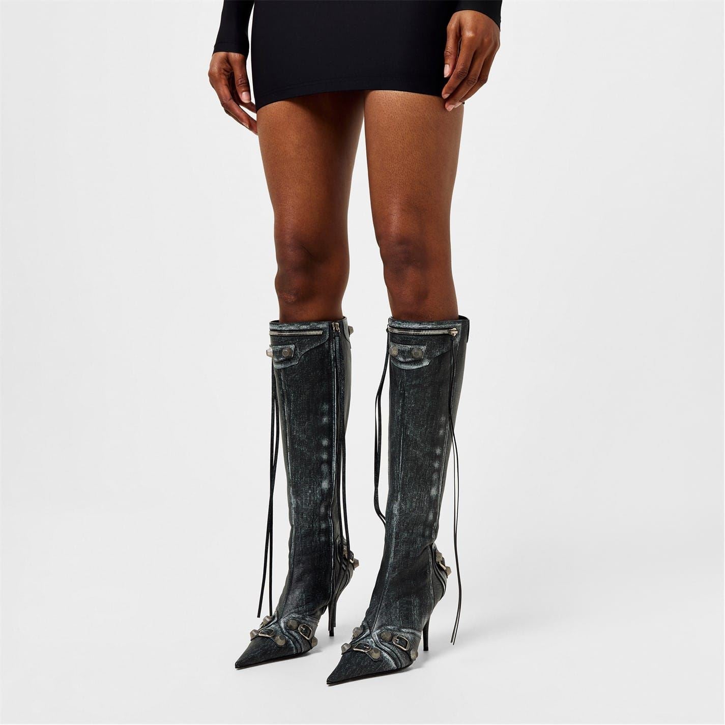 - Crafted from arena lambskin, these knee length boots exude effortless sophistication. The pointed toe and tone-on-tone covered stiletto heel accentuate the sleek and refined silhouette, while the inner zipped closure and front zip design with knotted leather pullers that drape to the heel, creating a captivating visual detail. The aged-silver hardware, combined with stud and buckle detailing across the shoe and leg, adds a touch of rebellious edge to your impeccable ensemble.