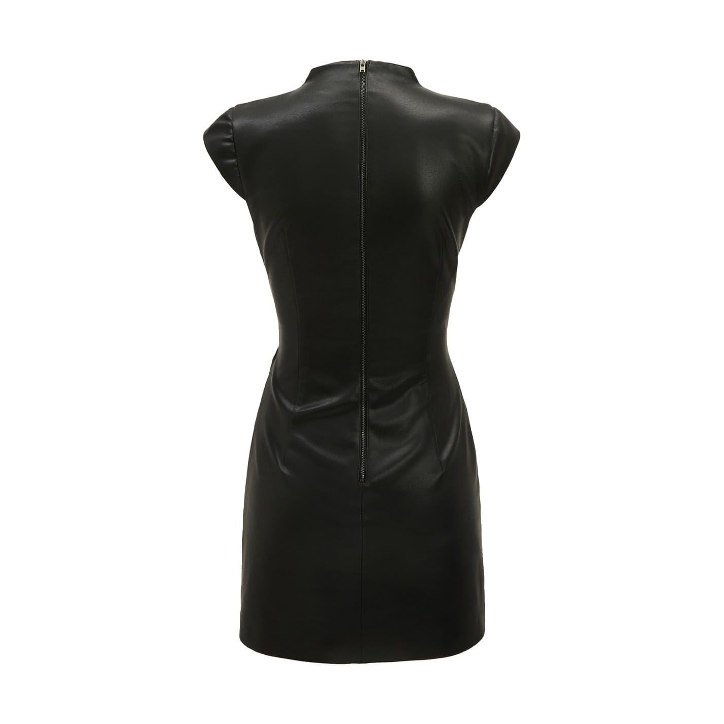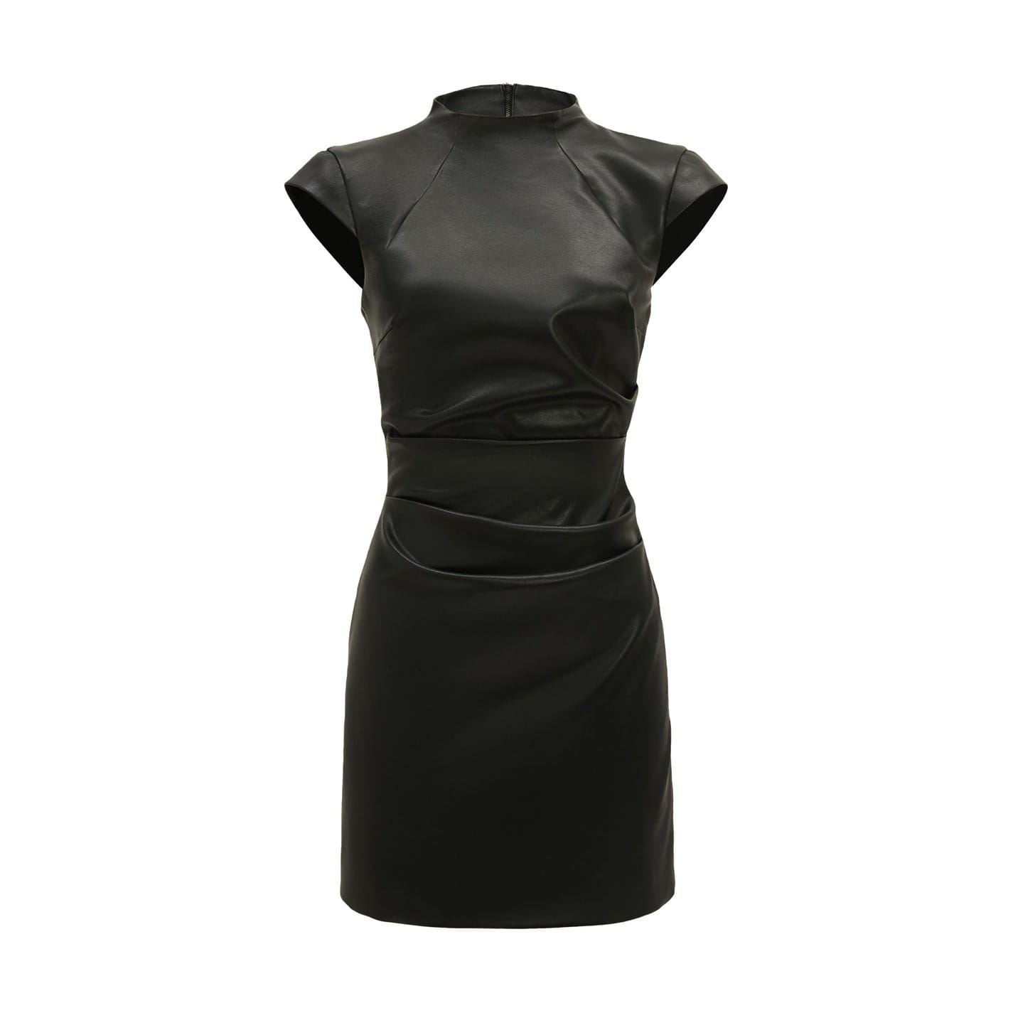 The Naja Vegan Leather Mini Dress is crafted in a bold vegan leather silhouette, and it features a mini-length cut with a high neckline, extended sleeves, soft gathers for shaping and a concealed zip closure.