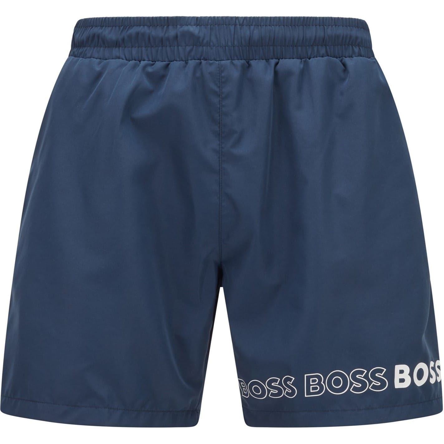 Feel good about yourself and the planet whilst swimming in style with these recycled Dolphin Swim Shorts brought to you by BOSS. Crafted from a pure recycled polyester fabrication with a mesh polyester lining, these shorts are cut in a regular fit and feature an elasticated waistband with inner drawstring fastening, twin slit pockets and a touch close back pocket for your essentials. The piece is finished with a branded tab to the back pocket, their iconic three colour tag on the back waistband and the BOSS logo printed to the left leg for true brand appreciation. Composition: 100% polyester (recycled). Lining: 100% polyester. Care Instructions: Machine washable at 30 degrees.