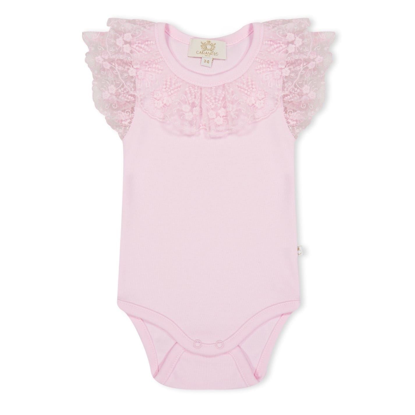 This Caramelo Kids top features a sleeveless design with a crew neck and ruffle sleeves. The regular fit is enhanced by delicate lace detailing and ruffles, adding a touch of elegance. The solid pattern offers a classic look, while the snap closure ensures easy wear.