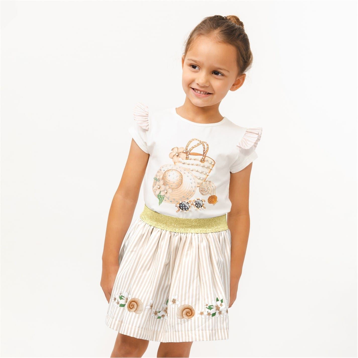 Explore the delightful Caramelo Kids top and skirt set, designed for style and comfort. The sleeveless t-shirt features a crew neck and showcases a playful combination of stripe and floral patterns. Complemented by an A-line skirt with a curved hem and ruffle embellishments, this regular fit set is perfect for any occasion.
