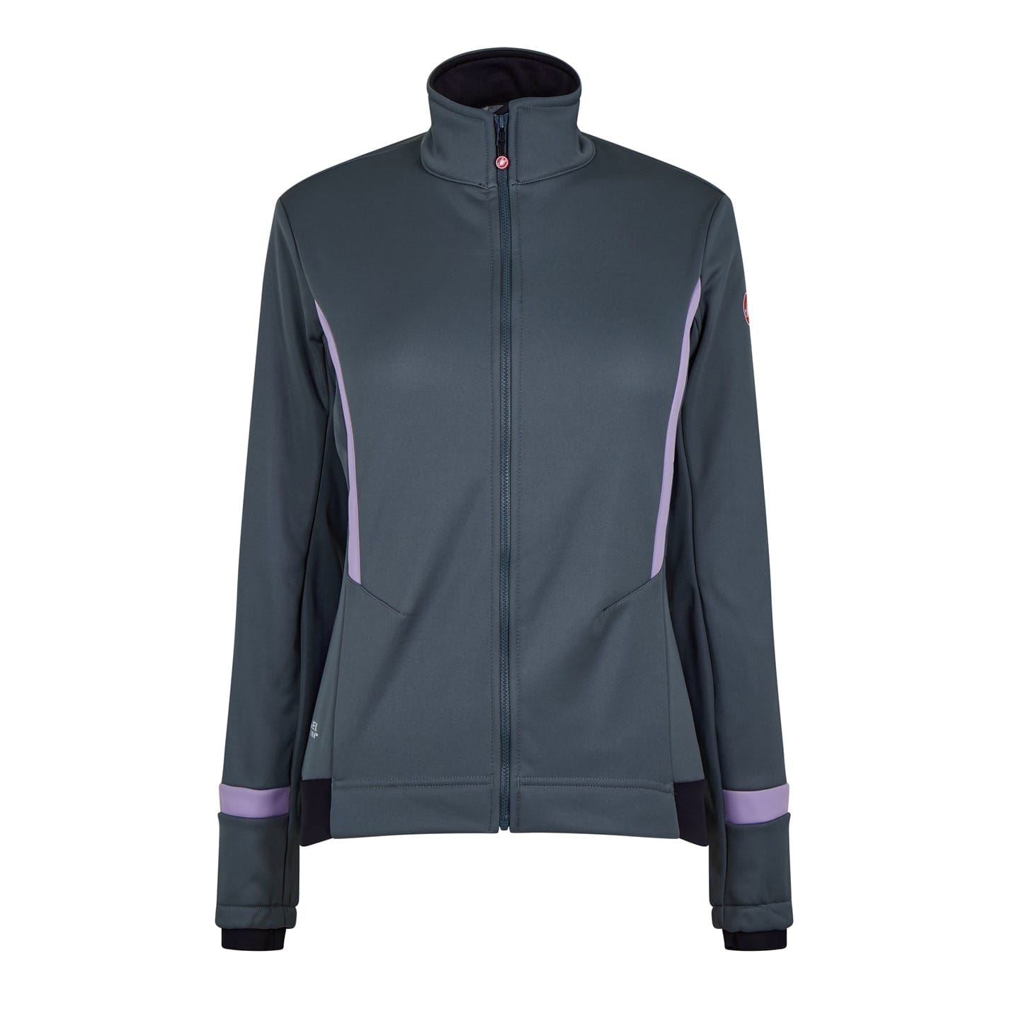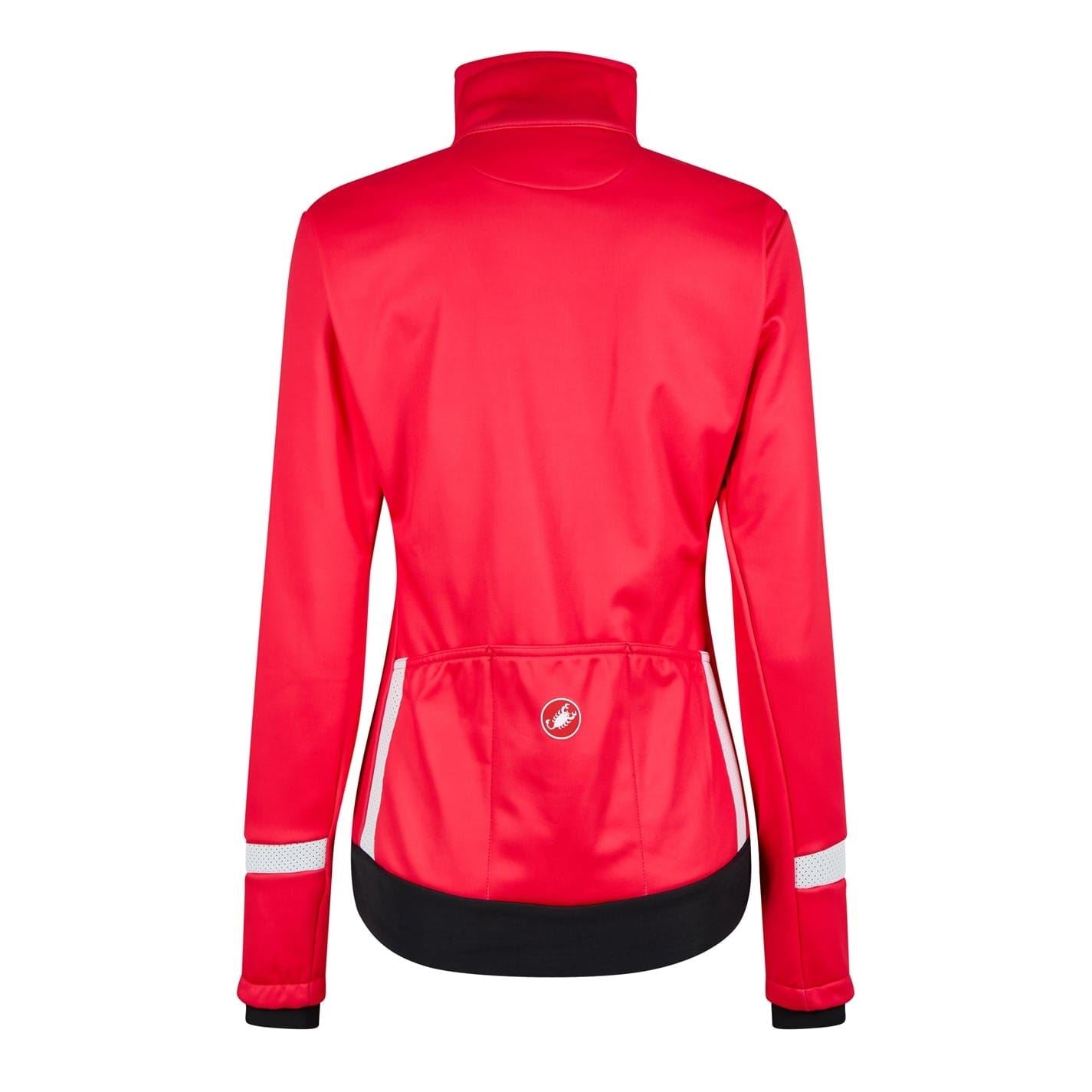 This Castelli track jacket from the activewear collection features a mock neck and a short length. It has a regular fit with a solid pattern and a straight hem. The jacket is equipped with a zipper closure and includes a logo and reflective ribbon embellishments for added visibility.