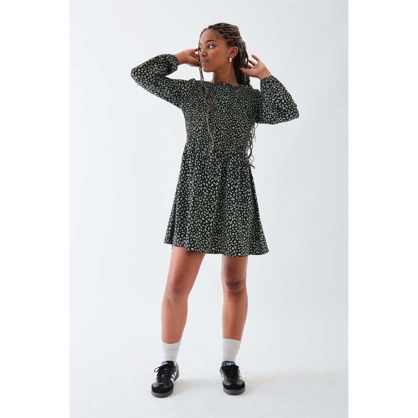 This Daisy Street mini dress features a charming floral pattern, complemented by a smocked design. The long puff sleeves and crew neck add a touch of sophistication, making it a perfect choice for a stylish and elegant look.