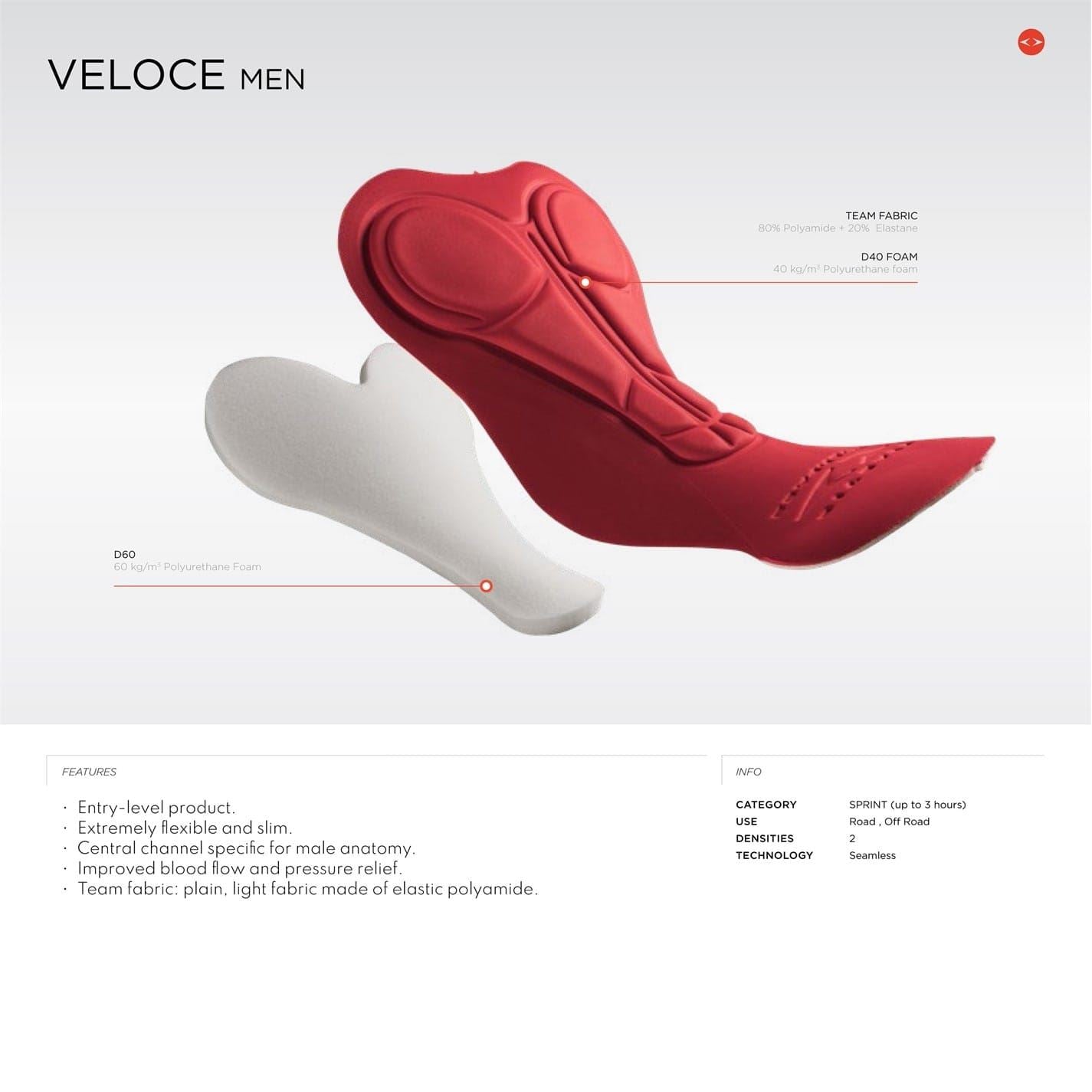 - Veloce men chamois has an advanced design, larger central inserts for better perineal coverage and softer wings throughout the inner leg area. This supple, light weight pad allows maximum freedom of movement and is ideal for touristic use or for racers that like lesser padding however still need protection in the main pressure points. Recommended for rides up to three hours.