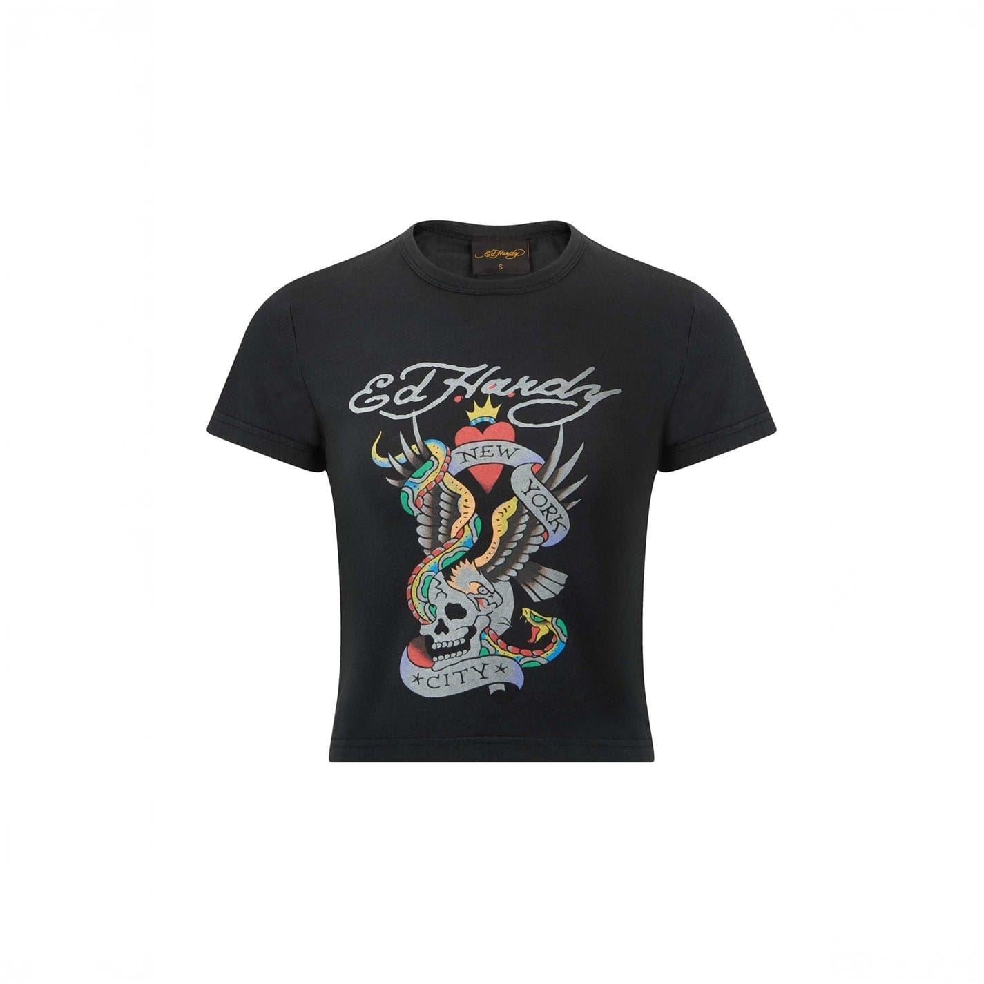 Discover the edgy style of this cropped t-shirt from Ed Hardy. Part of the casual collection, this NYC-inspired top features a striking graphic print, perfect for making a statement. With its classic crew neck and short sleeves, it offers both comfort and style for a laid-back look.