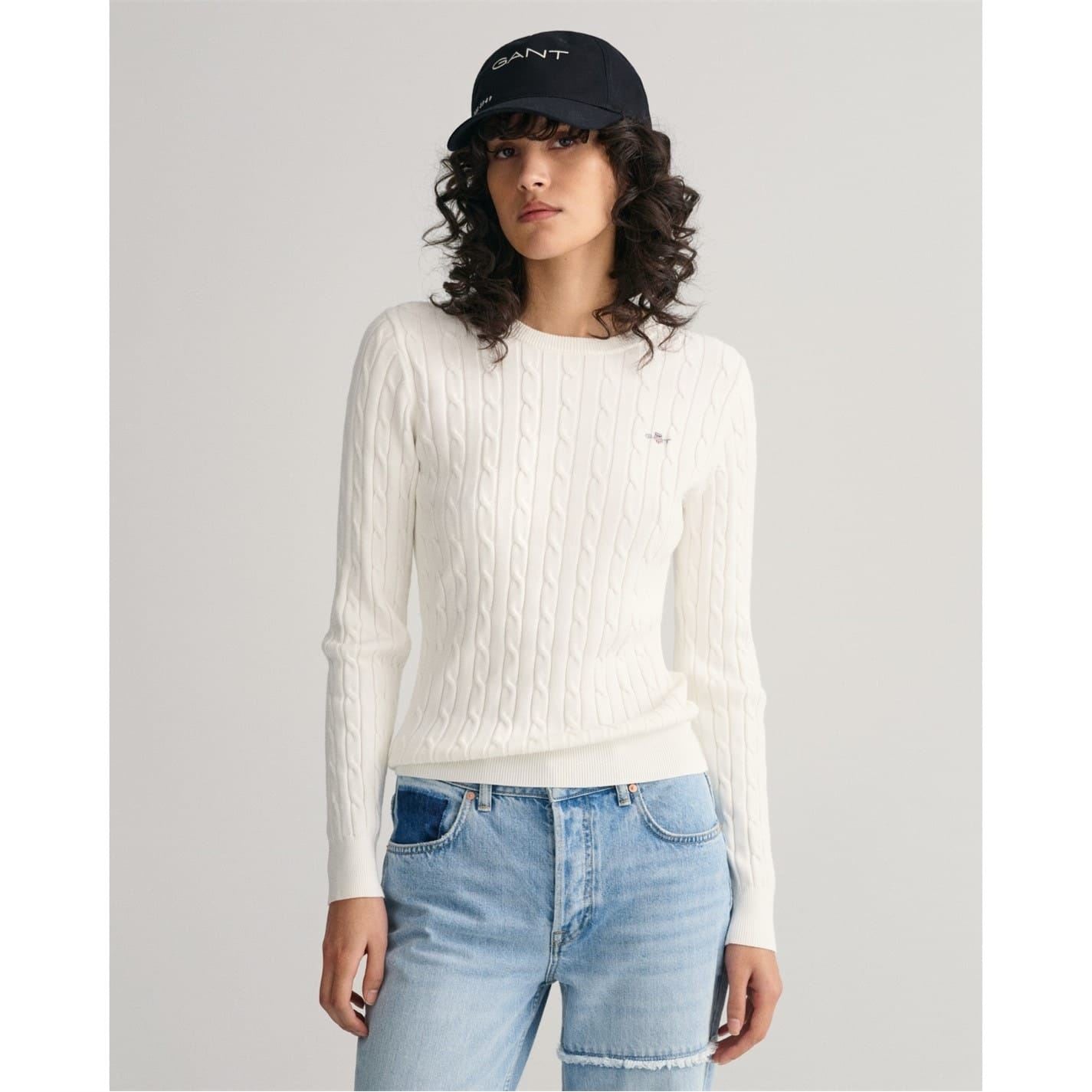 A GANT classic, this crew neck sweater has been designed in a cable-knit structure. Crafted from a soft cotton elastane blend for a slim yet stretchy fit, it has a GANT graphic embroidered at the chest and ribbed detailing at the collar, cuffs and hem. A versatile piece, it goes with anything from jeans and tailored pants to skirts and shorts.