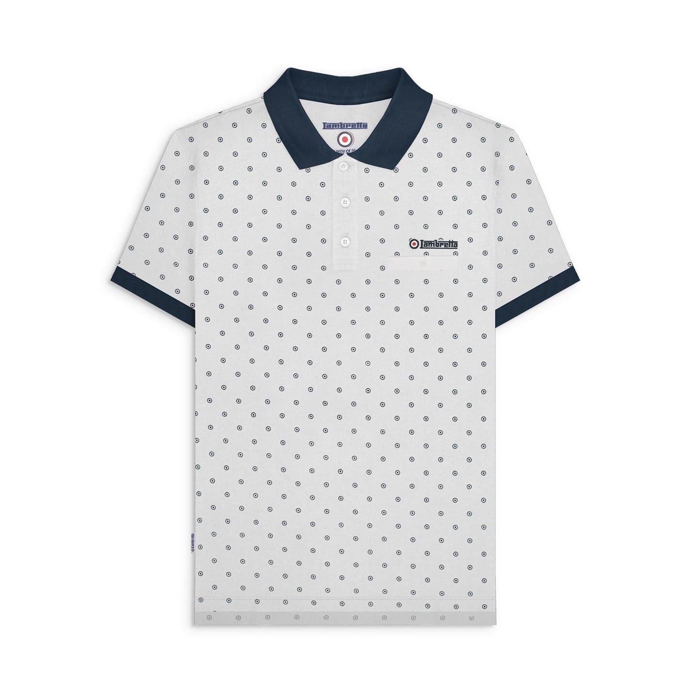 This Lambretta polo shirt from the semi-formal collection features a polka dot pattern and short sleeves. Crafted with a ribbed cuff and polo collar, it has a regular fit and button closure for a classic look. Ideal for those seeking a stylish yet understated top.
