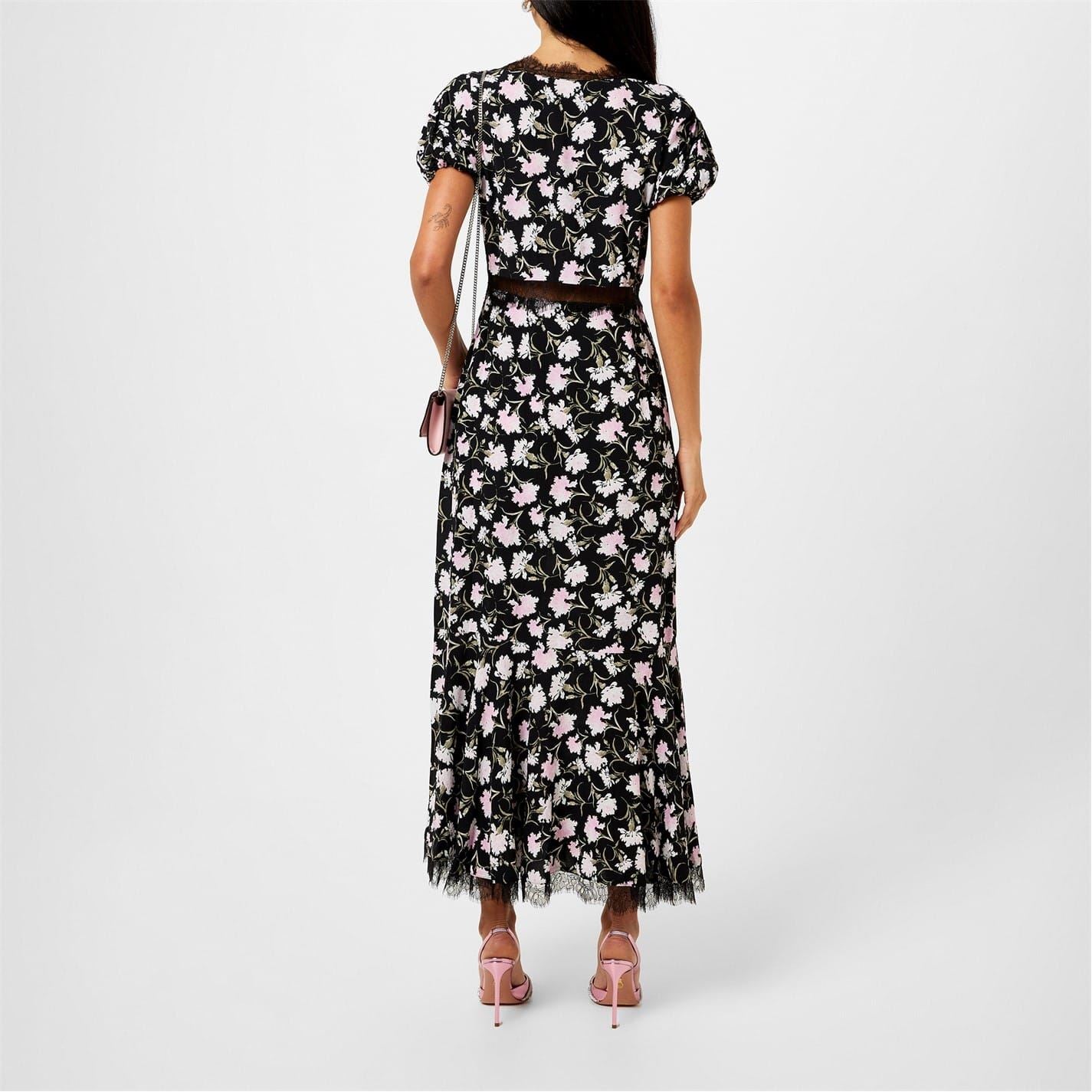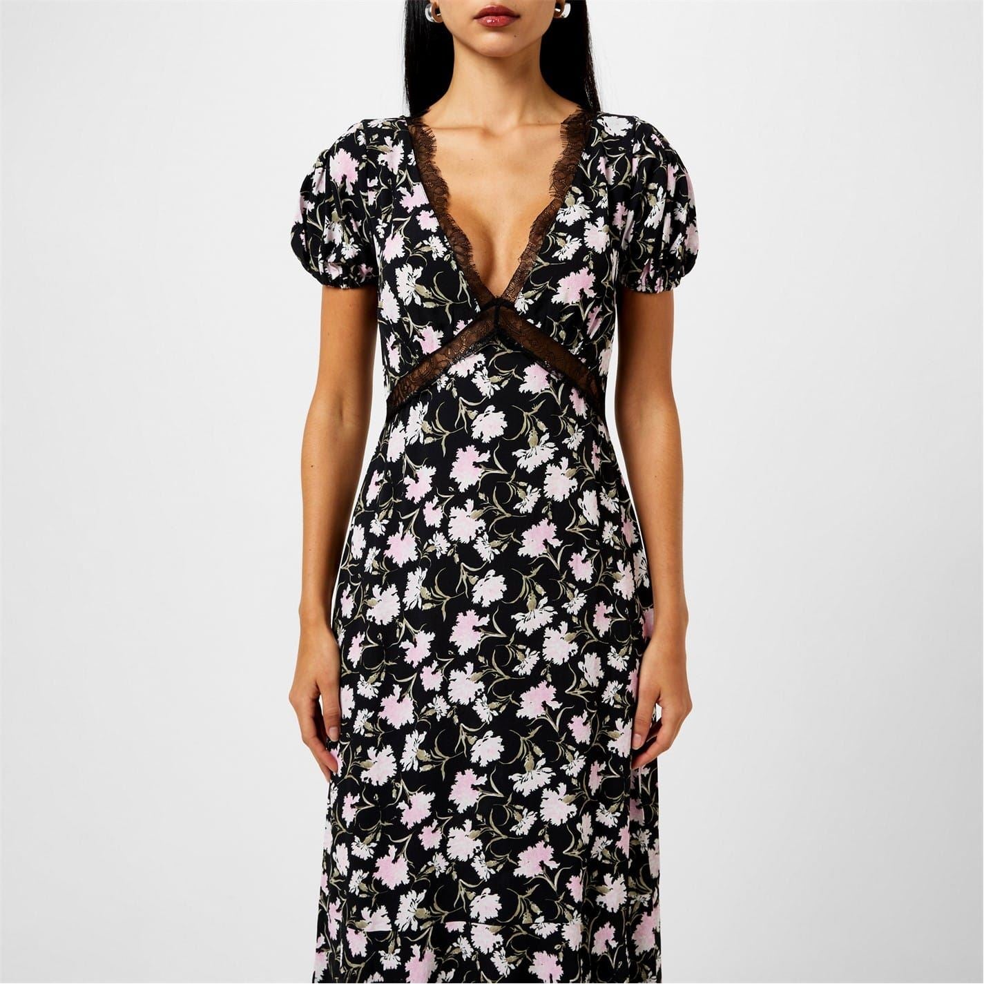This Love Shack Fancy midi dress features a charming floral pattern and a flattering A-line style. The V-neckline and short puff sleeves add a touch of elegance, while the lace trim embellishment enhances its delicate appeal.