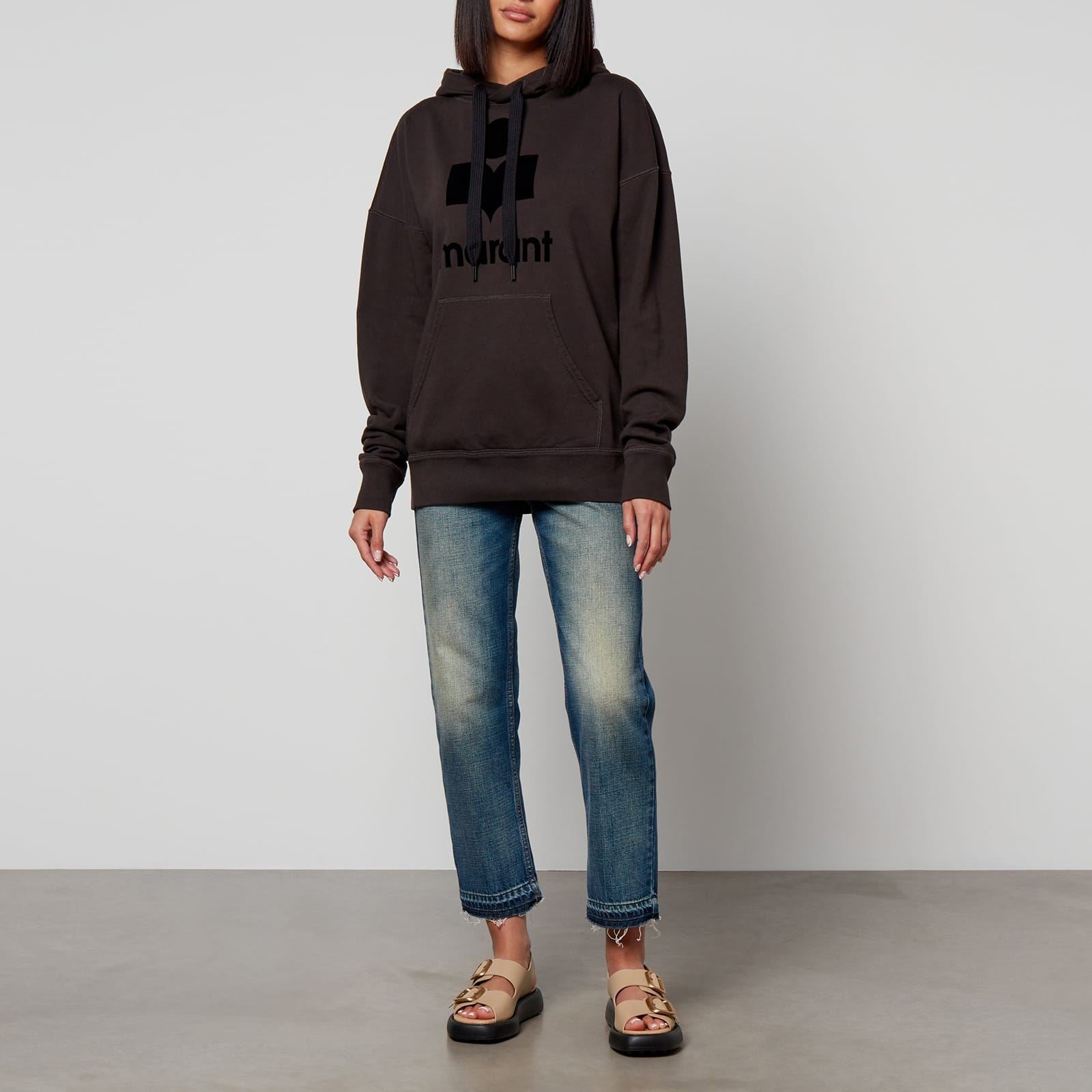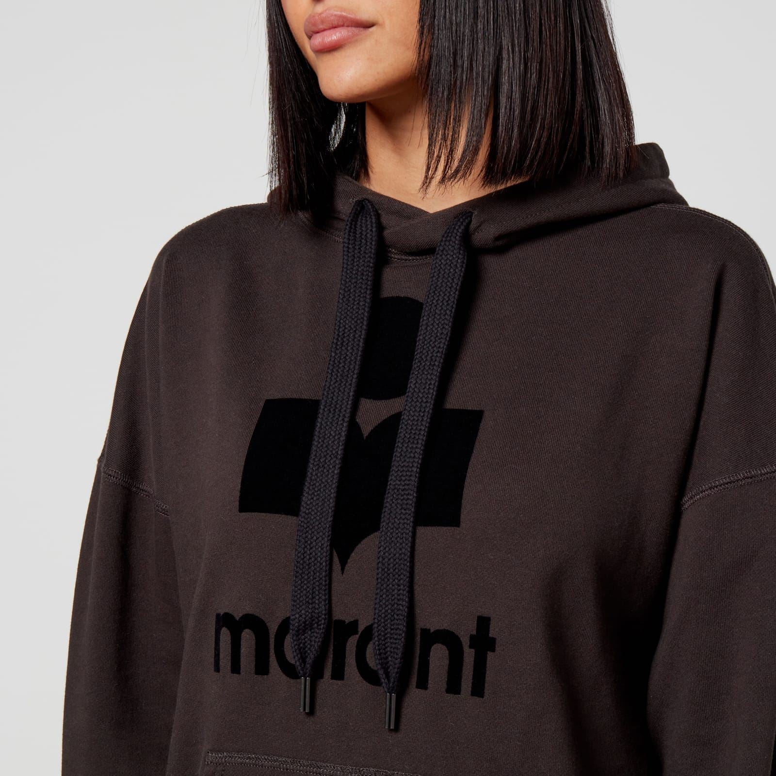 The hoodie is a pullover style with a kangaroo pocket and features a flocked logo on the chest. The logo includes the word marant with a stylized design above it. It is described as a relaxed-fit hoodie made from a cotton-blend fleece fabrication.