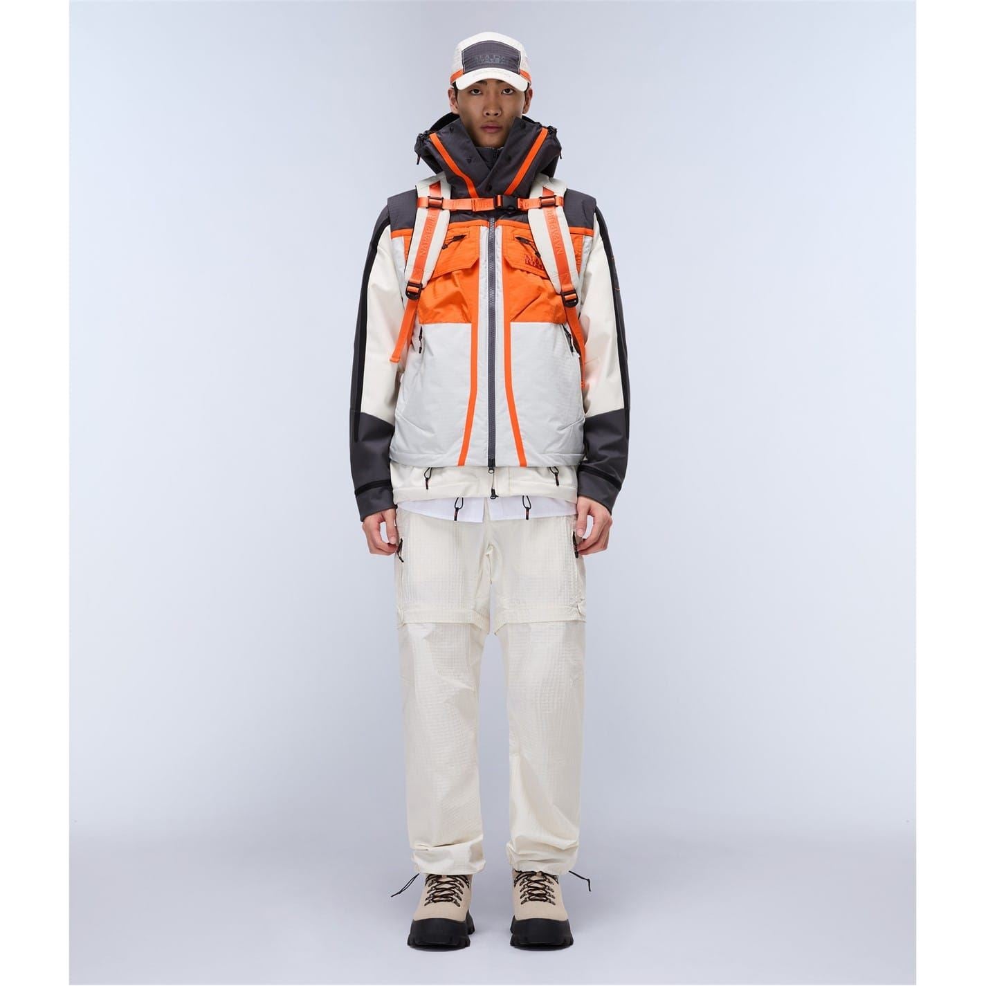 This Napapijri rain jacket features a hooded design and a water-repellent finish, perfect for wet weather. It has a regular fit with a straight hem and a practical zipper and snap button closure. The jacket showcases a stylish color block pattern, complemented by functional pockets and a subtle logo embellishment.
