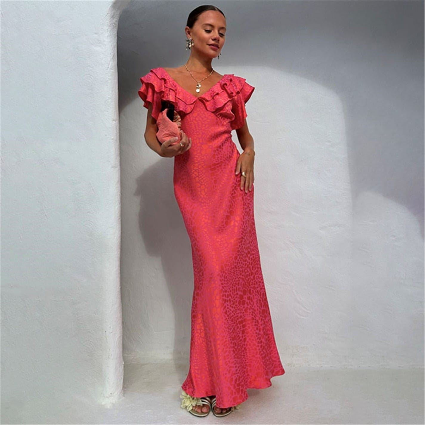 This Never Fully Dressed slip dress features a striking animal pattern, perfect for making a statement. The maxi length and V-neck design offer a sophisticated look, while the ruffle embellishments add a touch of flair. With a slim fit and straight hem, this dress is both stylish and comfortable, ideal for any occasion.