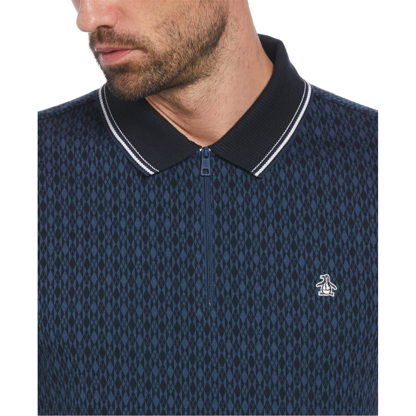 This Original Penguin polo shirt features a geometric pattern, making it a striking addition to your semi-formal wardrobe. Crafted in a regular fit with a polo collar, it offers a classic silhouette. The short sleeves end in ribbed cuffs for added style. A discreet logo embellishment completes this top, while a convenient zipper makes for easy wear.