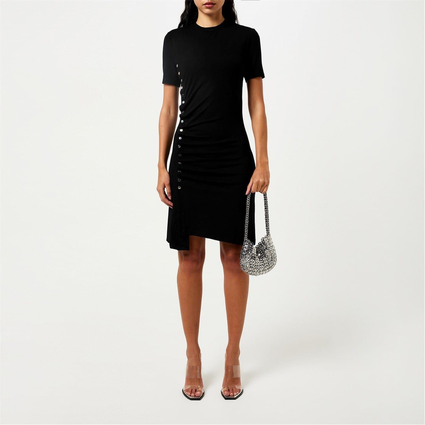 - Designed in timeless black with pleated detailing creating an eye-catching visual appeal. From daytime chic to evening allure, the Paco Rabanne Button Mini Dress is the perfect piece to elevate your confidence and style.