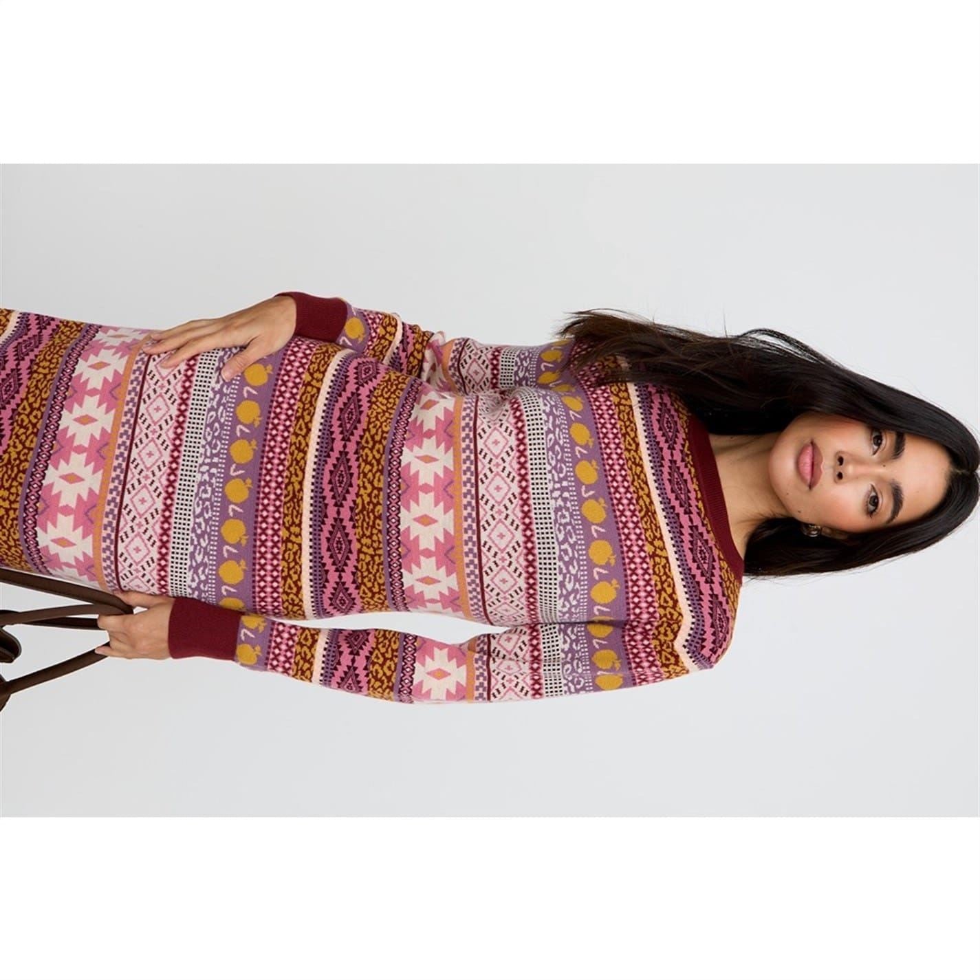 This Raffya maxi dress features a classic crew neck and a distinctive Fair Isle pattern, offering a unique style. The long sleeves and banded hem provide a comfortable regular fit, making it a versatile addition to any wardrobe.