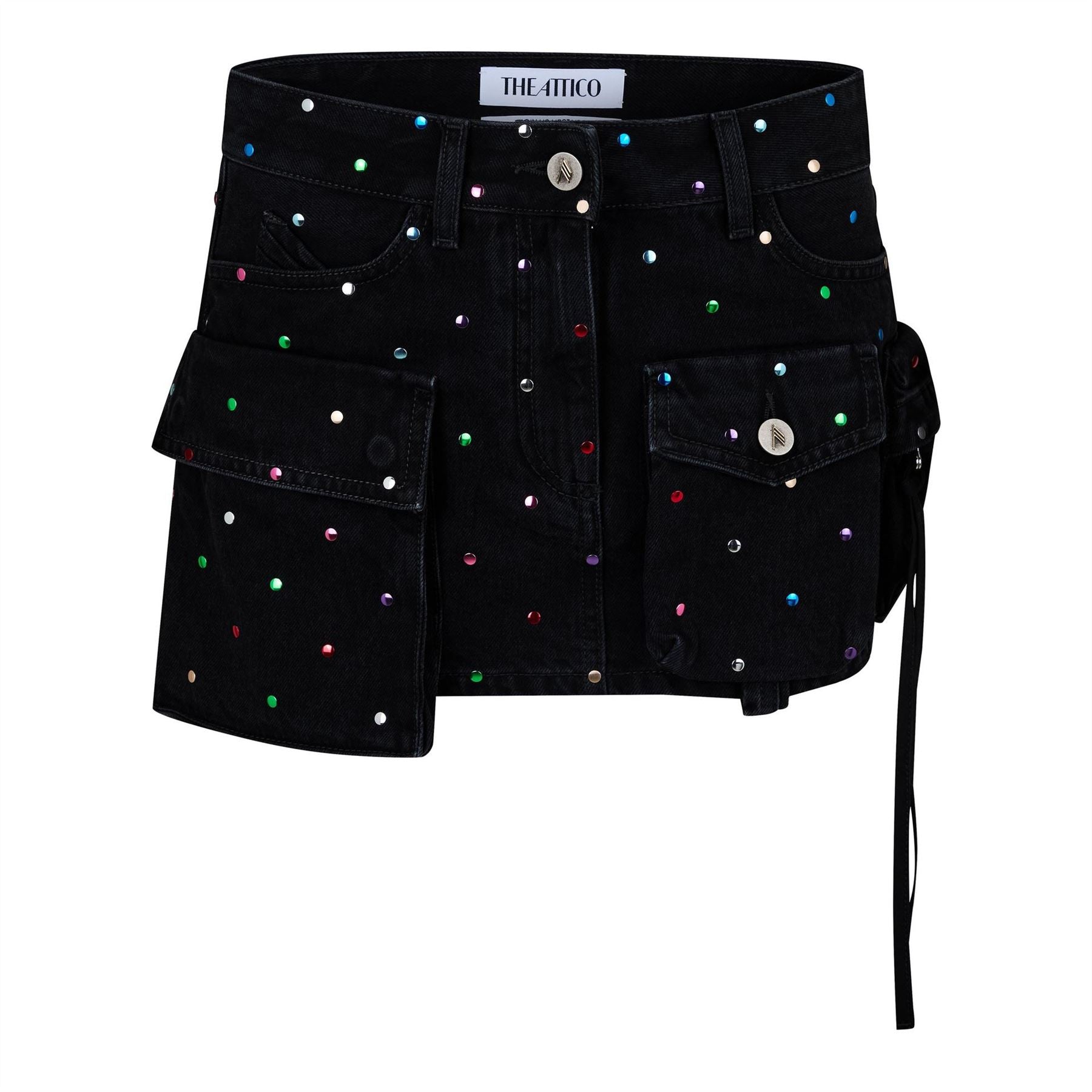 The Attico mini cargo skirt is a standout piece from the casual collection. Featuring a playful polka dot pattern, this skirt is adorned with crystal embellishments for a touch of sparkle. The button closure adds a practical element to its design, making it a stylish choice for any occasion.