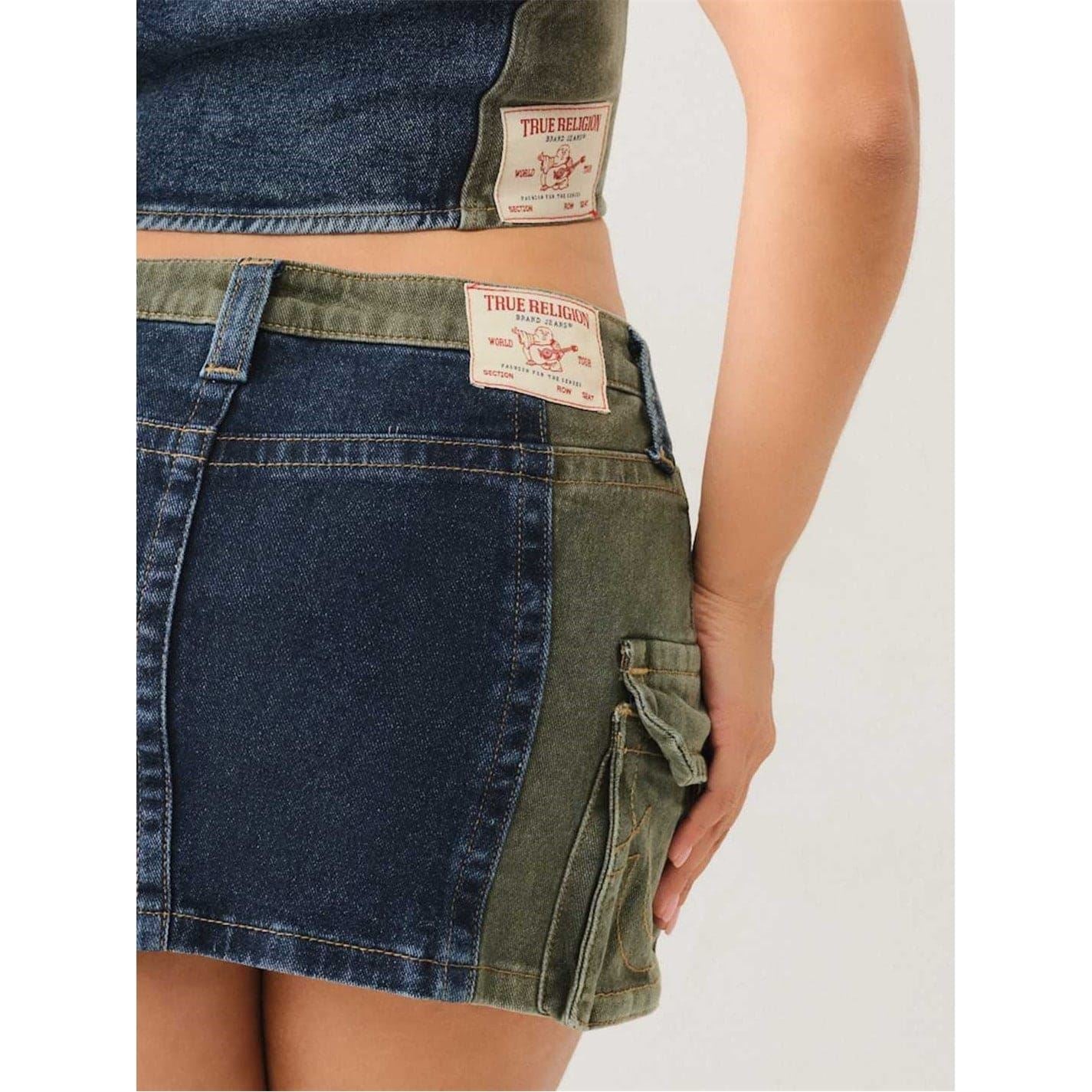 True Religion mini cargo skirt features a stylish color block pattern, perfect for casual collections. Designed with a regular fit, it includes practical patch pockets and a convenient zip fly closure. This skirt combines functionality with a modern aesthetic, making it a versatile addition to any wardrobe.