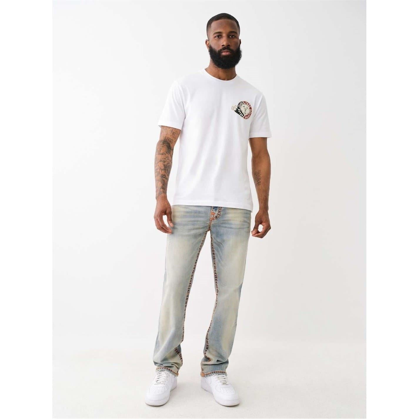 True Religion Ricky jeans feature a classic five-pocket design with a straight fit. The stone wash pattern and contrast stitch embellishments add a distinctive touch. These jeans are equipped with a zip fly and button closure, offering both style and functionality.