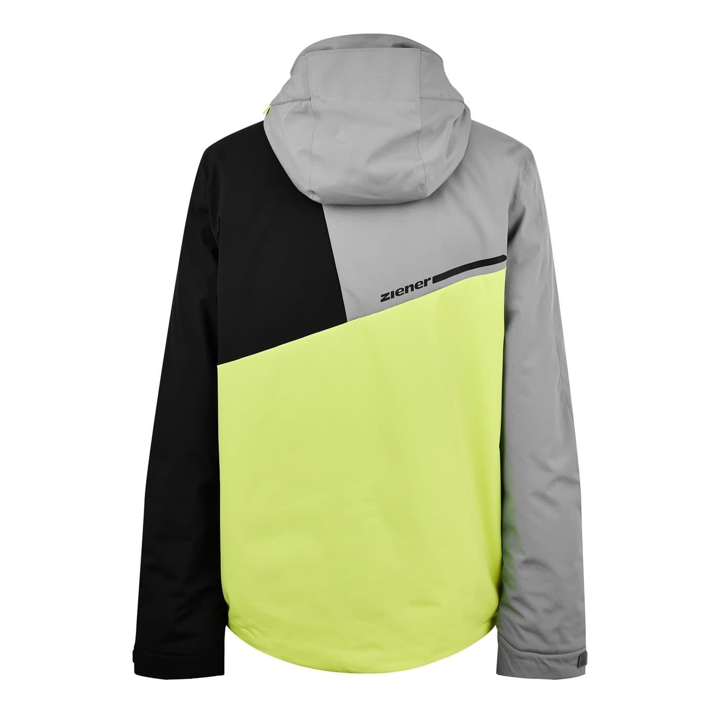 The Ziener ski jacket features a relaxed fit and a hooded design, perfect for winter sports. It showcases a stylish color block pattern and a practical zipper closure. The jacket is adorned with a logo embellishment, adding a touch of brand identity. The curved hem enhances its modern look, making it a functional and fashionable choice for cold weather activities.