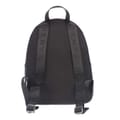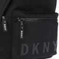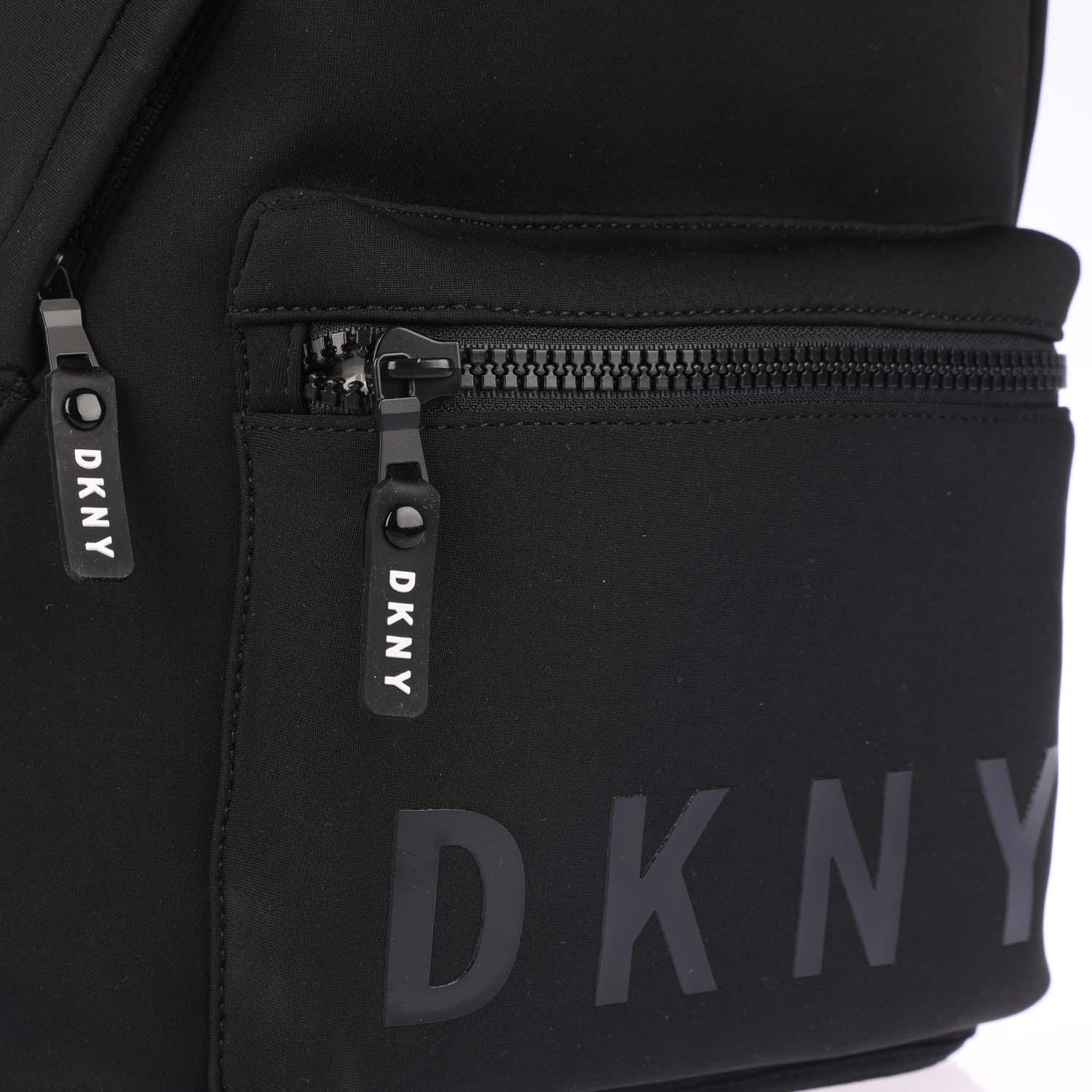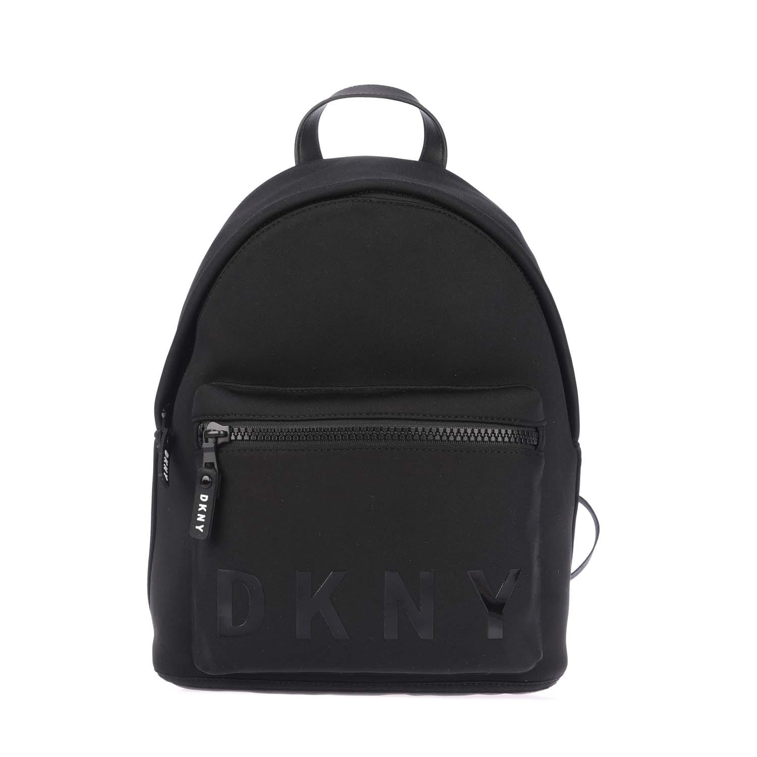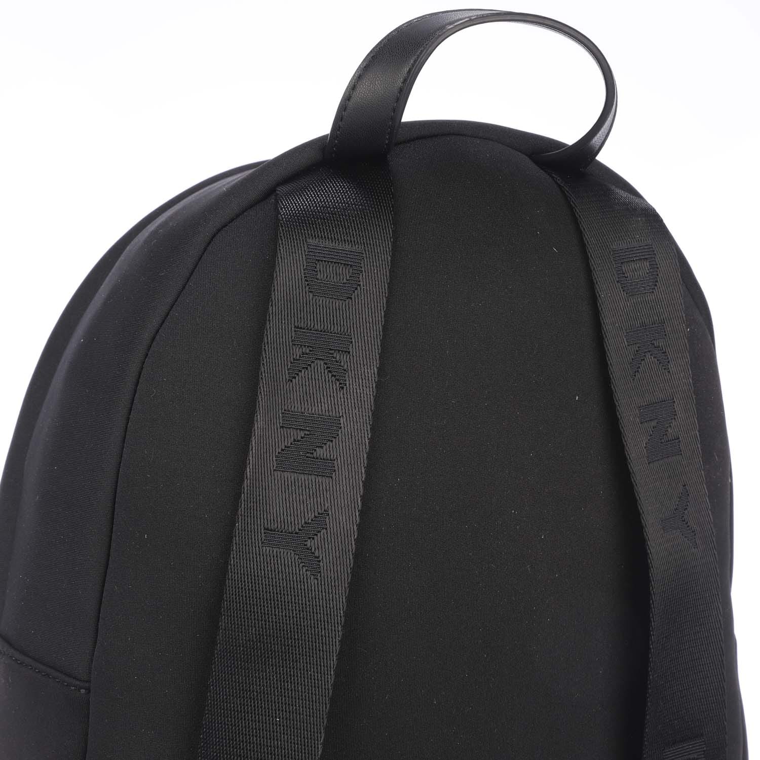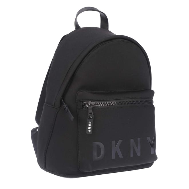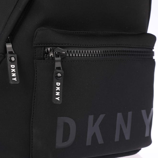 Adjustable shoulder straps with branding. Smooth nylon-like material. Zippered front pocket with a prominent embossed DKNY logo on the lower front. -
